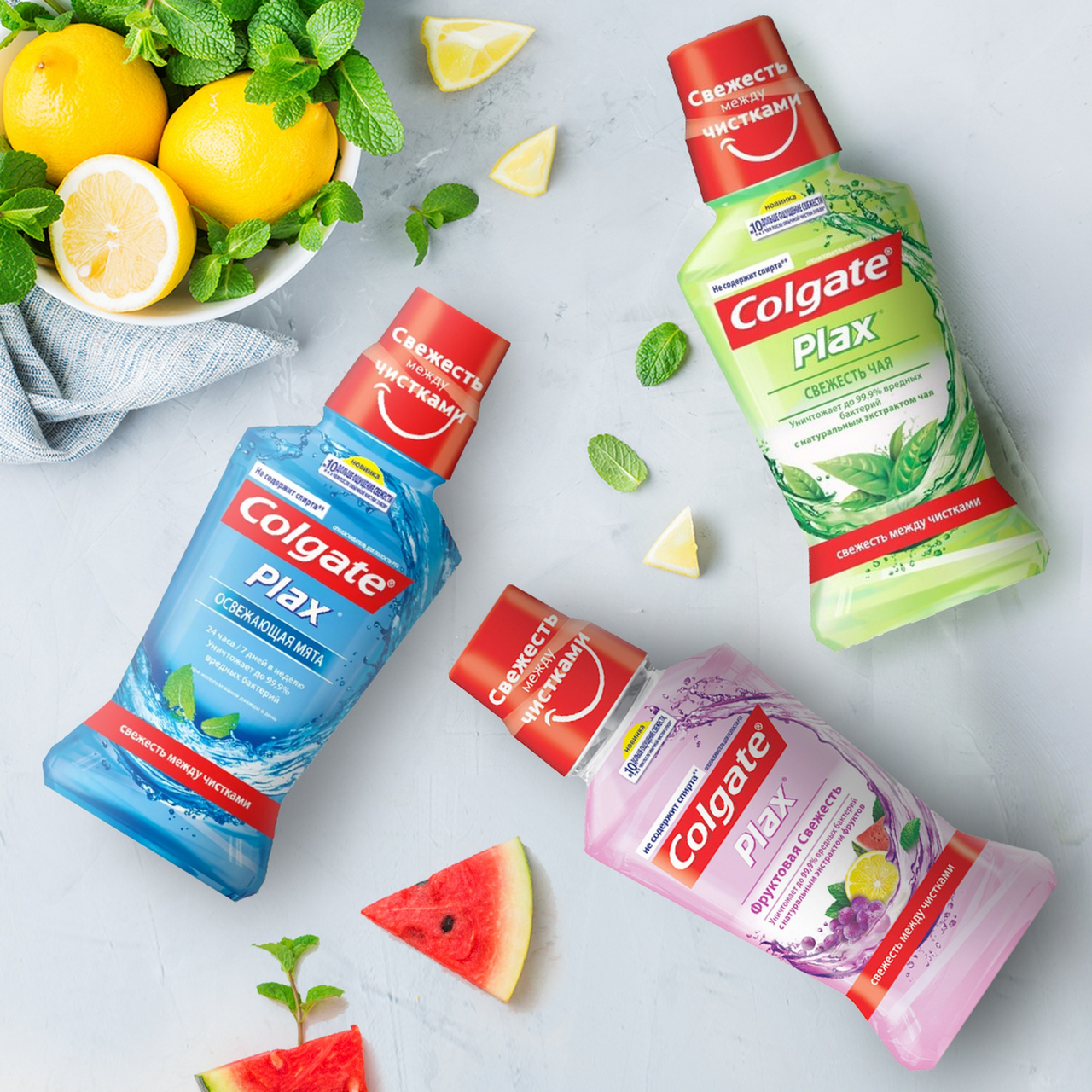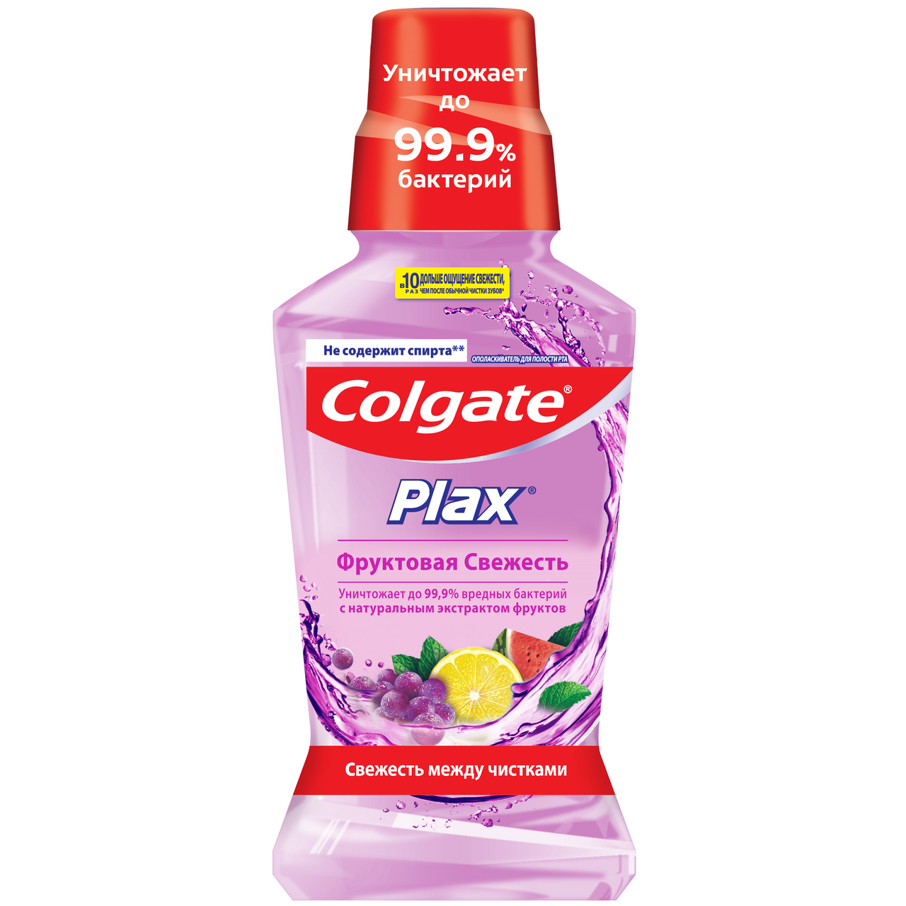 Ополаскиватель для полости рта Colgate Plax Фруктовая свежесть обеспечивает приятное свежее ощущение во рту 24 часа/7 дней в неделю благодаря аромату фруктов и мяты. -Эффективная формула уничтожает до 99,9% вредных бактерий, а содержащийся в составе фторид защищает от кариеса. -Не содержит спирта и безопасен для десен. -Colgate Plax Фруктовая свежесть в 10 раз дольше сохраняет ощущение свеже��ти, чем после обычной чистки зубов.