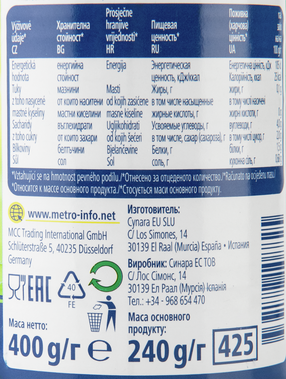 Артишоки METRO Chef резаные, 400-425 г представляют собой овощные консервы в собственном соку. Продукт не содержит консервантов, искусственных добавок, ГМО. Артишоки отличаются приятным внешним видом, чистыми бутонами, которые можно употреблять в сыром виде, готовить на гриле или пару, жарить, варить или тушить. Пикантный рассол идеально сочетается с оливковым маслом, чесноком.