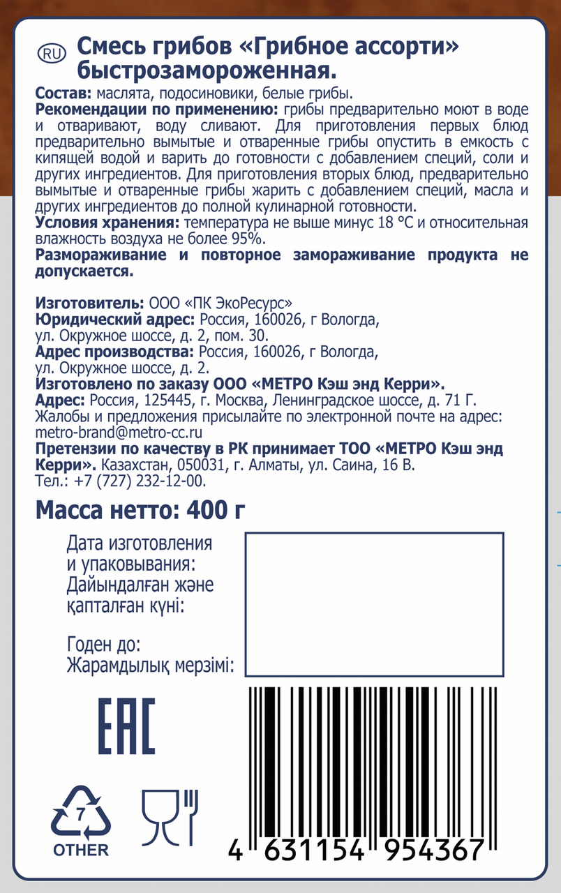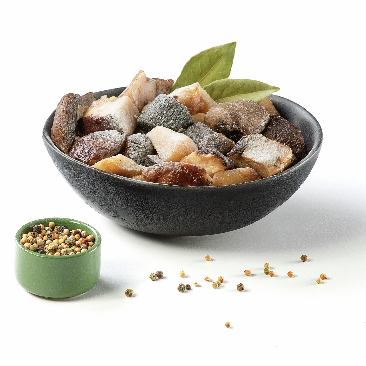 В состав смеси входят дикие лесные грибы. Это природный продукт, в котором допускается наличие небольшого процента червивости. Качество грибов контролируется на всех этапах - от приема сырья до заморозки, однако выявить наличие личинок и червоточин на 100% невозможно, так как это скрытые дефекты. Из-за специфики строения грибов (трубчатая или губчатая шляпка, бархатистая поверхность) в грибах также могут присутствовать минеральные и растительные примеси (хвоя, частички мха и т.д.).