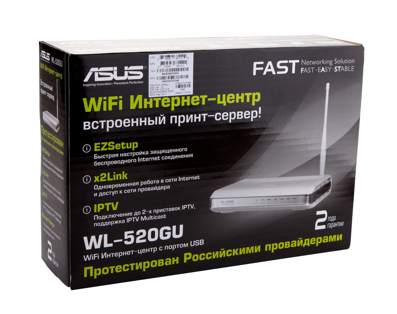 Asus WL-520GU роутер. Беспроводной маршрутизатор с поддержкой технологии Broad Range 125 Мбит/с серии EZ. Технологии EZConfig - EZSetup и WCN позволяют любому пользователю с легкостью настроить защищенную беспроводную сеть. Технология EZQoS – Гибкие настройки для комфортной работы с мультимедиа-приложениями, использующими Интернет. Технология EZPrint_Share позволяет беспроводным пользователям распечатывать документы на принтере, подключенному к маршрутизатору.