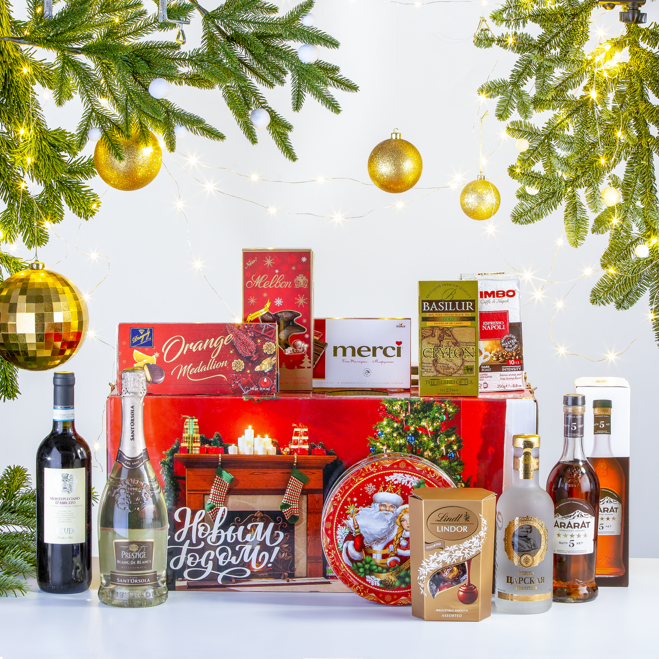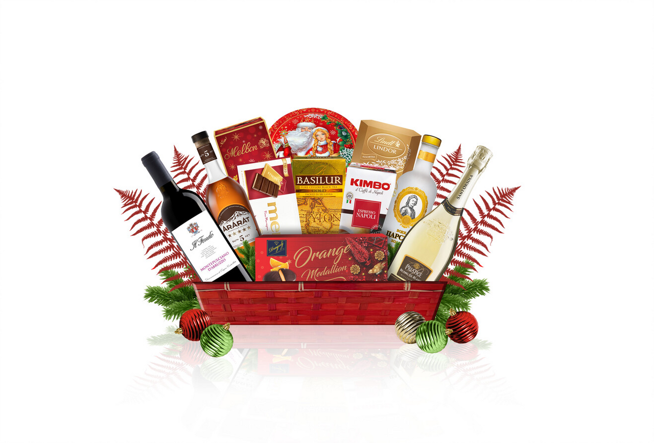 В состав набора входит: Шоколадные конфеты ассорти LINDOR 200 г, Конфеты пралине ракушки из молочного и белого шоколада Melbon 125 г, Шоколад темный с марципаном MERCI 112 г, Чай черный Золотой остров Basilur 25 пакетиков, Кофе молотый Espresso Napoletano Kimbo 250 г, Шоколадные медальоны со вкусом апельсина Dragulj 145 г, Печенье сдобное со сливочным маслом REGNUM 400 г, Вино красное сухое MONTEPULCIANO D'ABRUZZO DOC IL FEUDO 0,75 л, Вино игристое белое брют Blanc de Blancs SANT'ORSOLA 0,75 л, Водка Царская Золотая 0,5 л, Коньяк 5* Арарат 0,5 л, Корзина из картона. Эта подарочная корзина – настоящая восхитительная и полная находка для тех, кто ищет идеальный подарок представительского класса. METRO –лучшее место для таких покупок, как известно.Здесь мы собрали несколько типов алкоголя для тех, кто хочет выбора: коньяк 5*, водка и вино премиум класса – в одной корзине.Этот микс дополнен великолепными десертными товарами лучших в своём классе брендов. Никто не поспорит, что в сочетании LINDOR, MELBON и MERCI любой найдёт именно свой вкус и тип шоколада.В состав набора также входит отменный чёрный чай и молотый кофе. Дополняет всё большая подарочная узнаваемая коробка классического печенья REGNUM, которую всегда с радостью принимают в подарок и ставят на стол. Всё это великолепие упаковано в подарочную корзину. Она – часть этого подарочного набора.