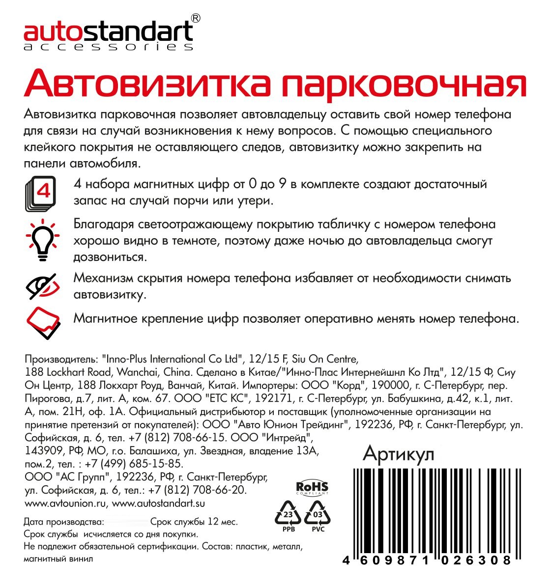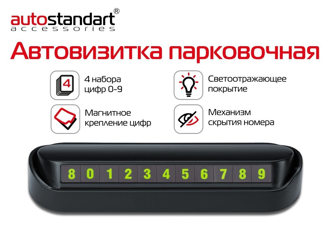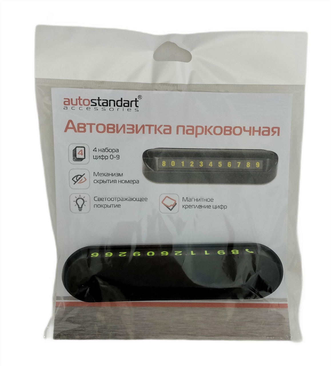 Автовизитка парковочная позволяет автовладельцу оставить свой номер телефона для связи на случай возникновения к нему вопросов. С помощью специального клейкого покрытия не оставляющего следов, автовизитку можно закрепить на панели автомобиля. 4 набора магнитных цифр от 0 до 9 в комплекте создают достаточный запас на случай порчи или утери. Благодаря светоотражающему покрытию табличку с номером телефона хорошо видно в темноте, поэтому даже ночью до автовладельца смогут дозвониться. Механизм скрытия номера телефона избавляет от необходимости снимать автовизитку. Магнитное крепление цифр позволяет оперативно менять номер телефона.