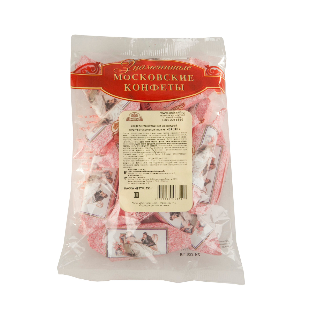 Конфеты Визит с говорящим названием – идеальны для похода в гости. Изысканная живописная упаковка и богатый вкус: плотное бархатистое пралине с насыщенным арахисовым привкусом и добавлением хрустящих осколков лесных орешков, утонченный шоколадный вкус глазури. Конфеты тают во рту и прекрасно сочетаются с кофе и чаем.