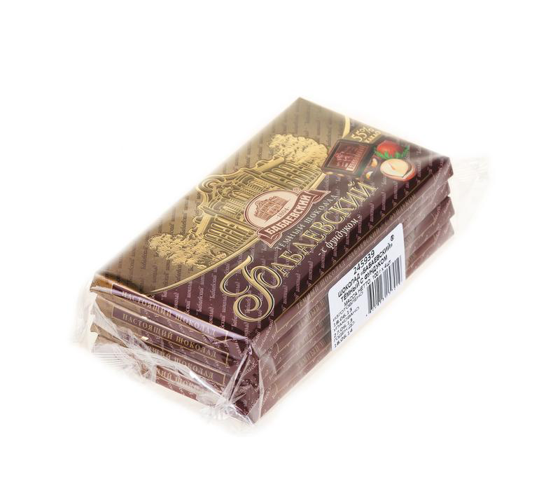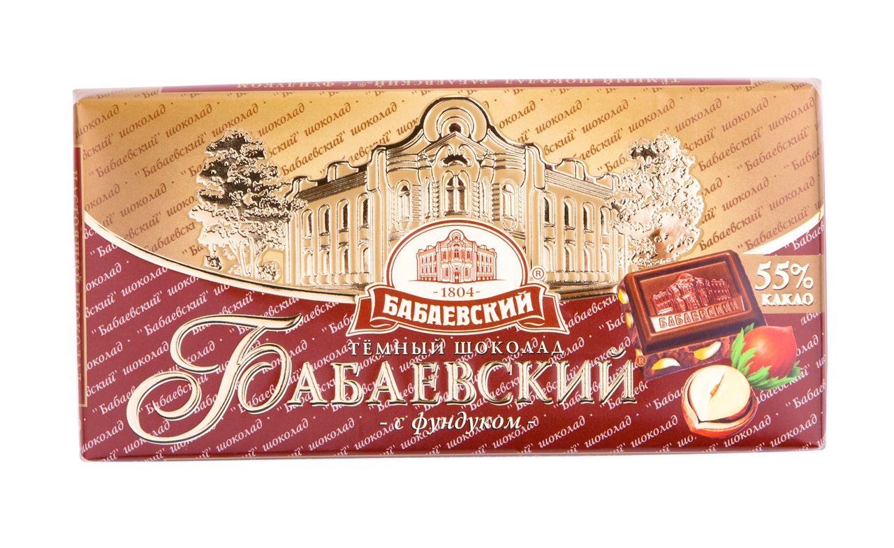 Описание и характеристики ОАО Кондитерский концерн Бабаевский. Шоколад Бабаевский темный с фундуком, 100г. Состав: сахар, какао тертое, масло какао, ядро ореха фундука половинки, жир молочный, эмульгаторы лецитин соевый, Е476, спирт этиловый ректификованный, чай, ароматизатор Ваниль. Массовая доля общего сухого остатка какао не менее 55,3%. Содержание какао продуктов 56,0% в темном шоколаде. Возможно наличие незначительного количества арахиса, орехов: миндаля и кешью, молочных продуктов, изюма и апельсиновых кусочков. Энергетическая ценность: 560 ккал. Пищевая ценность на 100г: белки 8,5г, жиры 39,0г, углеводы 41,0г. Хранить: при t от +15 до +21 'C и относительной влажности не более 75%. Не подвергать воздействию прямого солнечного света. Срок годности: 12 месяцев.