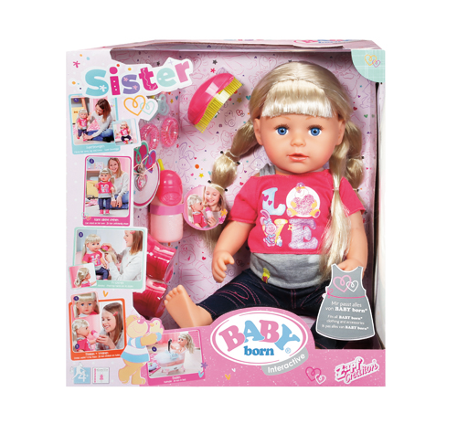Кукла высотой 43 см с длинными волосами. Пьет из бутылочки и плачет настоящими слезами. Ноги сгибаются в коленях, устойчива на горизонтальной поверхности. Можно купать. Комплектация набора: кукла в одежде и обуви, бутылочка, расческа, три заколки, две резинки, два браслета (один - для куклы, другой - для девочки). Возрастное ограничение 3+