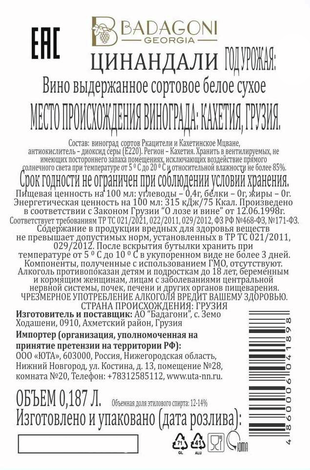 Вино Badagoni Tsinandali белое сухое, 0,187 л изготовлено из отборных плодов мцване и ркацители. Выращенные в грузинской Кахетии спелые ягоды собирают ручным способом в период полной зрелости и бережно удаляют стебли. После этого виноград аккуратно прессуют в резервуарах из стали и подвергают контролируемой ферментации в соответствии с традиционными рецептами виноделия. В результате напиток приобретает красивый золотисто-соломенный цвет и изящный цветочно-фруктовый ароматический букет. В его округлом вкусе звучит свежесть фруктов в сопровождении пикантной интенсивной кислинки. Чтобы в полной мере оценить вкусовые и ароматические характеристики благородного напитка, его рекомендуется подавать к столу, предварительно охладив до температуры около 12 C. Вино станет удачным вариантом легкого аперитива и составит хорошее сочетание с приготовленной на гриле или на пару рыбой, морепродуктами, пастой под разнообразными соусами, сырным ассорти.
