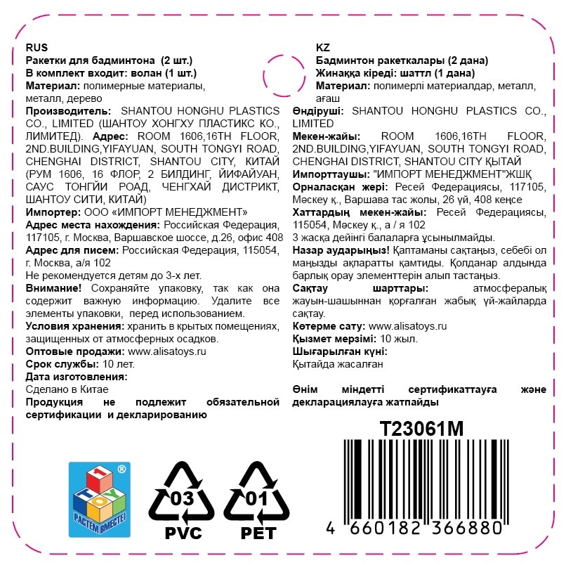 Набор для бадминтона от 1Toy включает 2 ракетки с удобными ручками и 1 волан. Длина ракетки 60см, размер игровой поверхности 23х21 (ДхШ), размер ручки 18х2,5см (ДхШ), размер волана 7,4см. Ракетки изготовлены из прочных полимерных материалов и металла. Они лёгкие, хорошо сбалансированы и устойчивы к деформациям. Воланы сохраняют форму и обеспечивают стабильную траекторию полёта. Игра в бадминтон способствует развитию координации движений, реакции и внимания. Улучшается моторика, повышается выносливость. Набор подойдёт для игры во дворе, на даче, в парке или на пляже - везде, где есть немного свободного пространства.
