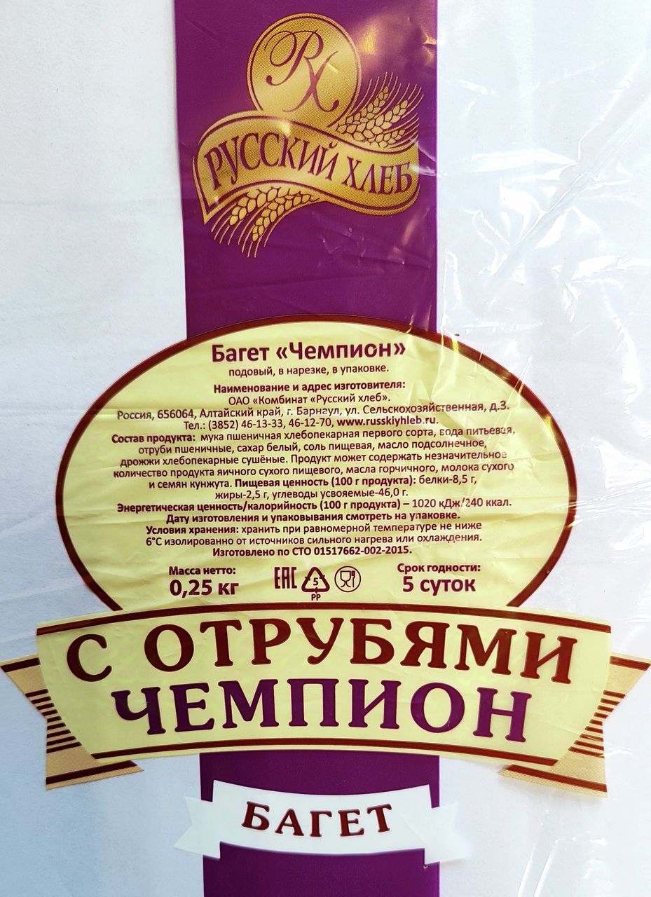 Багет Русский хлеб Чемпион с отрубями нарезка, 250г