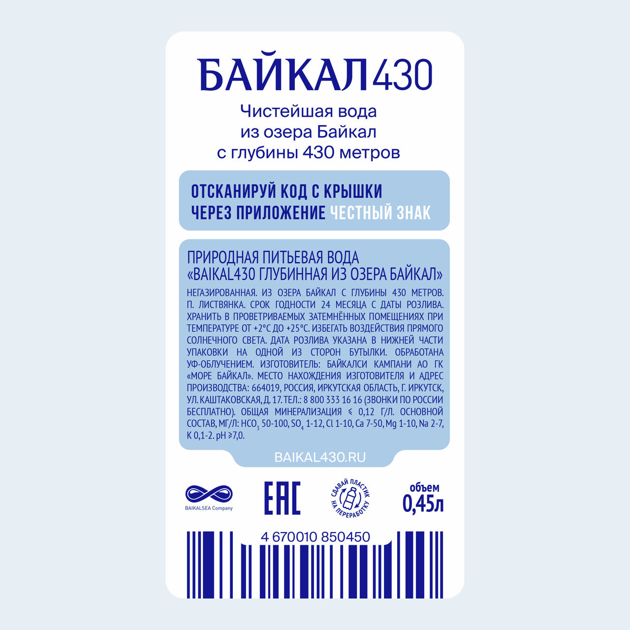 Вода Baikal430 Байкальская глубинная питьевая негазированная, 450мл