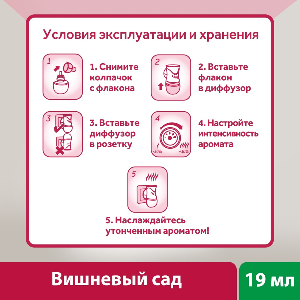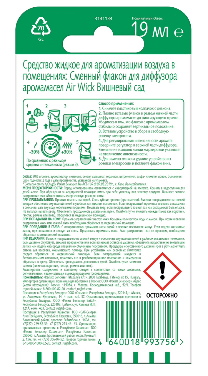Флакон сменный для диффузора аромамасел AirWick Вишневый сад, 19мл обладает ярким и ненавязчивым ароматом, который создаст приятную атмосферу в помещении. Многие современные средства характеризуются довольно резкими и пряными запахами. Их избыток может вызвать неприятные ощущения. Освежитель воздуха от известного бренда действует намного мягче и деликатней. Его специально разработанная система направлена на то, чтобы создать максимально комфортные условия, блокировать неприятные запахи. Флакон устанавливают в совместимое устройство. Распыление происходит автоматически, его интенсивность можно варьировать или вовсе отключить диффузор на время отсутствия (командировки, путешествия). Создайте весеннее настроени�� с нежным нотками цветущей вишни. Подарите вашему дому более 100 дней деликатного аромата с диффузором аромамасел Air Wick. AirWick — американский бренд, под которым на рынок поставляются средства для ароматизации воздуха. В ассортименте представлены средства ручного и автоматического распыления с различными ароматами. Они подходят как для эксплуатации в квартире или жилом доме, так и административных учреждениях. Средства сделаны из качественных и безопасных компонентов, не вызывают аллергии. Продукция торговой марки представлена более чем в 60 странах мира, пользуется заслуженным спросом, уважением и доверием со стороны покупателей.