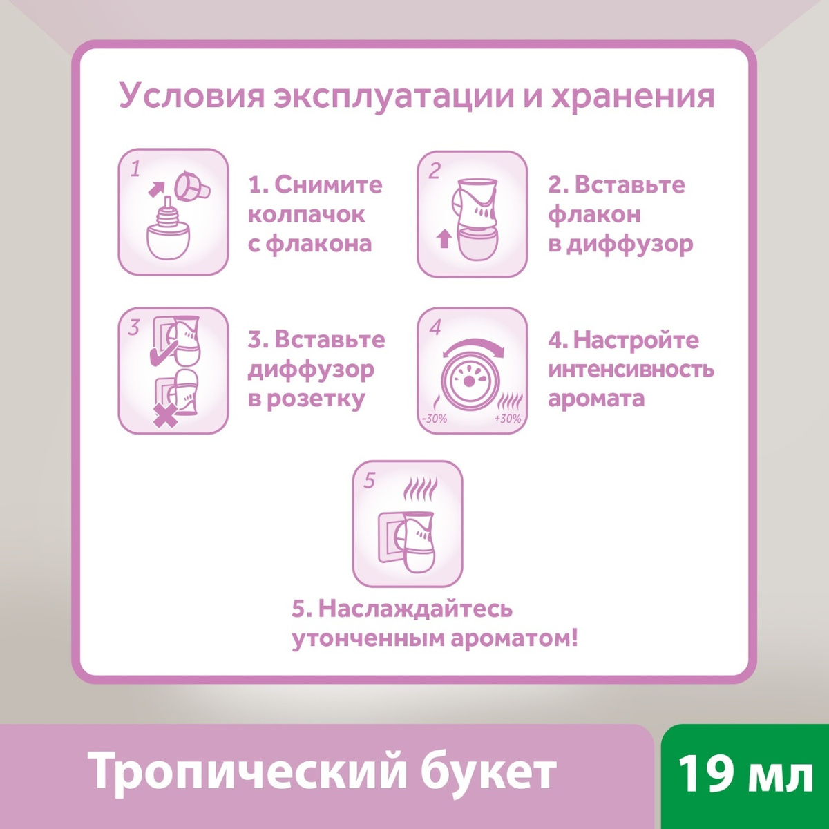 Флакон сменный для диффузора аромамасел AirWick Тропический букет, 18мл поможет вам оказаться на тропическом острове вместе с манящими нотками экзотических цветов благодаря содержанию натуральных эфирных масел. Подарите вашему дому более 100 дней деликатного утонченного аромата с диффузором аромамасел Air Wick.
