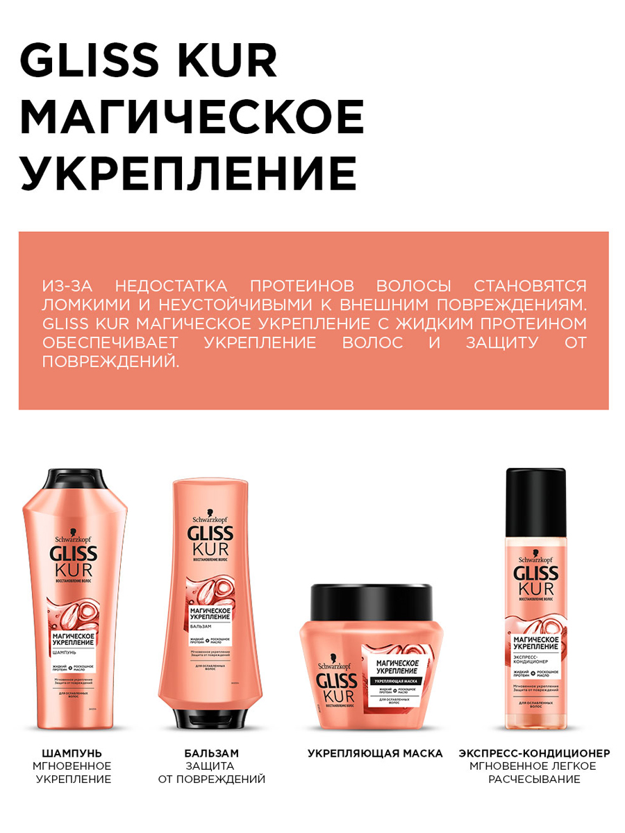 Из-за недостатка протеинов волосы становятся ломкими и неустойчивыми к внешним повреждениям. Глисс Кур Магическое укрепление обеспечивает: Укрепление с жидким протеином. Лёгкое расчесывание. Устойчивость к повреждениям.