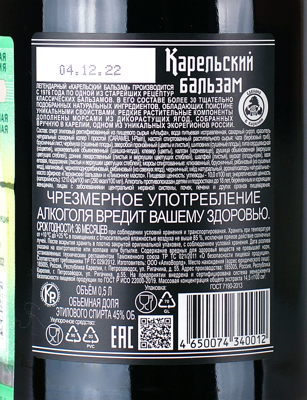 В состав Карельского бальзама входит более 30 ингредиентов, среди которых: брусника, зверобой, черемуха, липа, трутовик, чага, шиповник, клевер, можжевельник, калган, донник, душица, еловая хвоя, мускатный орех, подорожник, шалфей, клюква, малина, рябина обычная и черноплодная, черника, мед, перуанское бальзамное масло. Однако не все компоненты настаиваются на спирте, около 50% — это спиртовые морсы высокой вязкости и плотности. Именно такая технология позволяет сохранить полезные свойства изюма, черники, малины, бузины и других полезных ягод. Благодаря им, а также меду, бальзам получает сладость, густоту и красивый коричнево-красный оттенок. Доля каждого элемента тщательно выверена, а с помощью современных технологий и оборудования обеспечивается сохранение целительных природных свойств, вследствие чего бальзам оказывает не только положительное влияние на тонус организма, но и способствует его оздоровлению. Из-за своей высокой крепости Карельский бальзам употребляется в небольших дозах, не превышающих 100-150 грамм в день.