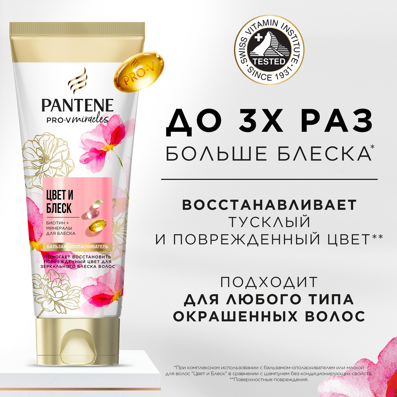 Мечтаете, восстановить тусклый оттенок? Верните жизнь окрашенным поврежденным волосам с шампунем Pantene Цвет и Блеск для профессионального ухода. Формула с биотином, минеральным комплексом и высочайшей концентрацией смеси Pro-V помогает восстановить волосы после окрашиваний и химических процедур. Коллекция придает блеск тусклым волосам за 1 применение, питает волосы и работает на видимом уровне (разглаживает и поддерживает оттенок) и невидимом уровне (восстанавливает изнутри). Откройте полную гамму средств Цвет и Блеск, включая бальзам-ополаскиватель, маску для волос и несмываемое масло для зеркального блеска. Это уникальное увлажняющее средство для волос. Его формула, обогащенная комплексом Pro-V, глубоко увлажняет склонные к сухости, тусклые волосы, придавая им исключительную мягкость и здоровый блеск. Бальзам-ополаскиватель с гиалуроновой кислотой и биотином ежедневно ухаживает за волосами, обеспечивая им необходимое питание, чтобы они выглядели здоровыми, полными жизни и энергии.