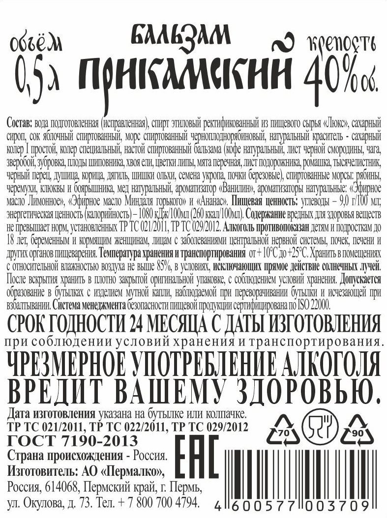Создан в 1983 году на одном из признанных производителей Урала - на заводе Пермалко. 34 натуральных компонента в составе - дикорастущие ягоды, травы, коренья и специи, собранные в экологически чистых уголках Прикамья. 30 дней выдержки и настаивания - благодаря чему вкус бальзама становится особенно насыщенным и сбалансированным. Аутентичный вкус - каждый ингредиент раскрывается постепенно, формируя сложный, многослойный вкус, в котором чувствуется природная сила региона. Этикетка украшена архитектурным образом этнографического музея Хохловка - важным элементом культурного наследия Пермского края. Прикамский бальзам известен и любим несколькими поколениями жителей Пермского края. Бальзам рекомендуется в качестве аперитива, дижестива, а также употребляется с чаем или кофе.