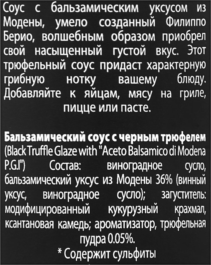 Бальзамический уксус из Модены 60%, винный уксус (вино), концентрированное виноградное сусло, краситель Е150d, концентрированный виноградный сок, модифицированный кукурузный крахмал, трюфели 1%, загуститель: ксантановая камедь, ароматизатор.