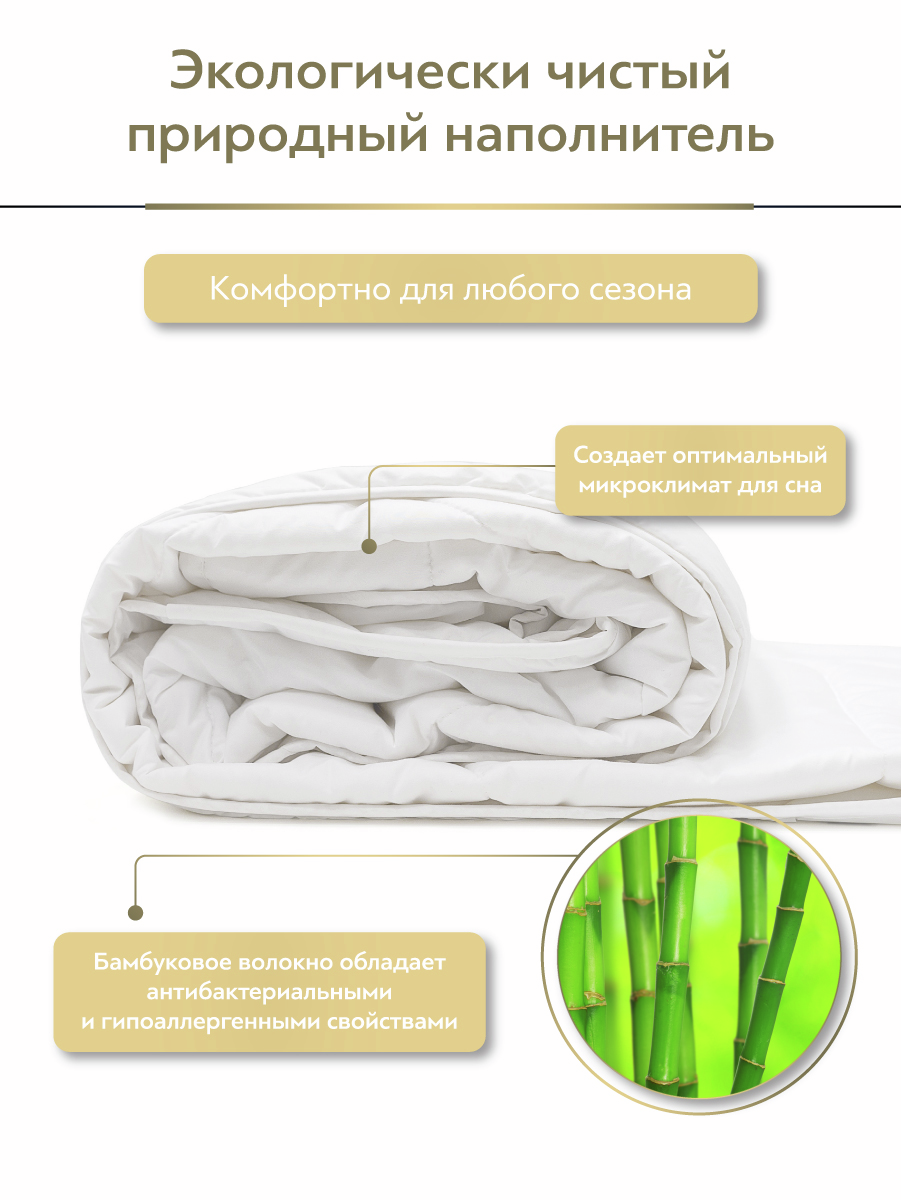 Одеяло Classic by T Бамбук Эко, 200 х 210 см удивительно мягкое и теплое. Экологически чистый наполнитель обладает высокой теплоизоляцией. При этом он имеет небольшой вес и, благодаря своей пористой структуре, обеспечивает отличную воздухопроницаемость, придавая изделиям удивительную легкость и воздушность. Изделия из бамбука гипоаллергенны и обладают антибактериальным эффектом, обеспечивая защиту от воздействия вредных микроорганизмов. Также они способны хорошо впитывать и испарять влагу, создавая здоровый микроклимат во время сна. Уход: не подвергайте химической чистке для сохранения уникальных природных свойств бамбукового волокна. Рекомендуется машинная стирка в щадящем режиме с обычными моющими средствами при температуре не выше градусов 30, без последующего отжима в центрифуге. Не отжимайте вручную. Сушить в расправленном виде в горизонтальном положении.