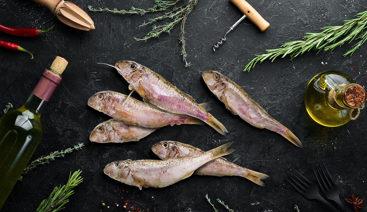 Барабулька Черноморская, 15-40 г – это морская рыба из отряда Окунеобразных, которая имеет удлиненное тело, которое сжато с боков. Её отличительными особенностями являются красная спинка, белое брюшко и жёлтые плавники. С подбородка свисают два длинных усика. Такая стайная рыбка издавна ценится за свои уникальные вкусовые качества, в частности, у неё отсутствует желчь – благодаря этому её зачастую даже не разрабатывают перед приготовлением. Это значительно упрощает процесс подготовки блюд. Продукт является очень полезным для организма. Мясо этой морской рыбы считается к диетическим. Оно состоит из легкоусвояемых белков и полиненасыщенных жирных кислот Омега-3. Кроме того, в барабульке содержатся витамины A, B1, B9, E, PP и такие минеральные вещества, как йод, фосфор, хлор, железо, магний и др. Такую рыбу можно обрабатывать любым кулинарным способом. Её варят, сушат, жарят на гриле, тушат, вялят и готовят на пару. Мясо барабульки получается весьма нежным и вкусным. Очень ароматной получается уха из неё. Нередко барабульку подают с головой, но без внутренностей. Современные гурманы жарят такую рыбку в толченных сухарях и тушат в белом вине со специями и листьями винограда.
