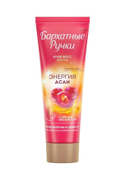 Бренд Бархатные Ручки представляет крем-мусс для рук Энергия асаи, который содержит 40% масла ягод асаи*. Легкий крем обладает уникальной воздушной текстурой, напоминающей взбитый ягодный мусс. Он нежно распределяется по коже, не оставляя ощущения липкости, а специальный компонент в составе крема ускоряет синтез протеина и повышает энергию клеток в 10 раз! Этот заряд энергии помогает увеличить их жизнеспособность на 60% и продлить молодость кожи рук.АЛЛАНТОИН - бесцветное кристаллическое вещество натурального происхождения. Оказывает смягчающее и увлажняющее действие, стимулирует обновление клеток эпидермиса. МАСЛО МИНДАЛЬНОЕ оказывает смягчающее, питательное и защитное действие на кожу, быстро впитывается. Ускоряет заживление при нарушениях целостности кожных покровов и нормализуют кислотно-щелочной баланс кожи. Подходит для любого типа кожи.ВИТМАИН Е - основной физиологический антиоксидант рогового слоя кожи. Витамин Е усиливает действие других витаминов и антиоксидантов, снижает выраженность различных типов раздражения кожи. МАСЛО АСАИ богато омега-кислотами, витаминами и антиоксидантами.Клетки кожи испытывают увеличивающийся стресс по мере старения, и им необходимо тратить большее количество энергии для своей защиты. КРЕАТИН улучшает энергетический обмен клетках, поддерживает защиту кожи от внешних воздействий, увлажняет кожу.КРЕАТИН улучшает энергетический обмен клетках, поддерживает защиту кожи от внешних воздействий, увлажняет кожу.Крем обладает нежной и легкой текстурой. Подарите Вашим рукам идеальный уход и энергию!РЕЗУЛЬТАТ: отдохнувшая кожа, которая сияет красотой!*в масляном комплексе, отмеченном в составе Узнайте больше о продукте на официальном сайте www.silkyhands.ru/