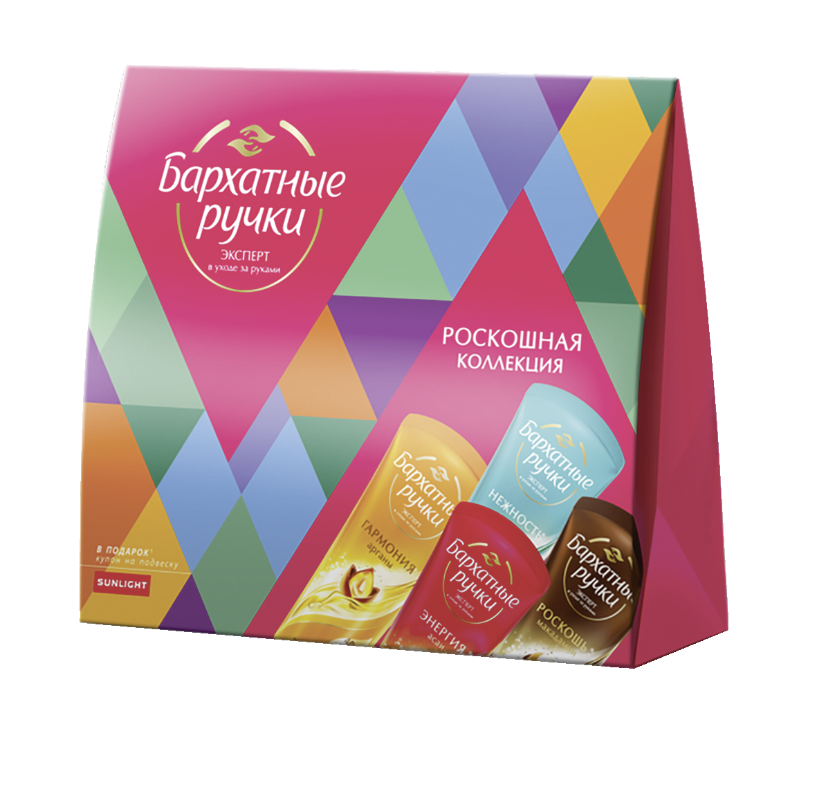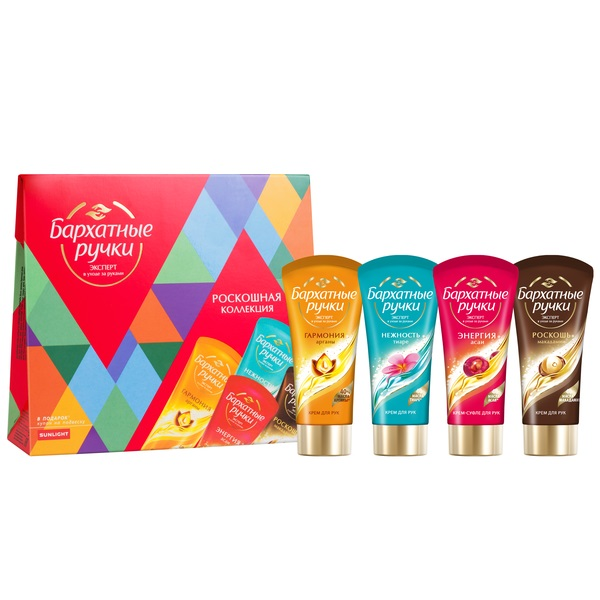 Бренд Бархатные Ручки представляет подарочный набор для рук Роскошная коллекция - мир удивительных ароматов и эффективный уход за кожей рук на любое настроение! В состав набора входят роскошных 4 крема для рук Бархатные ручки: Гармония арганы, крем-мусс Энергия асаи, легкий крем Нежность тиаре и насыщенный крем Роскошь макадамии.КРЕМ ДЛЯ РУК КОРОЛЕВСКАЯ АРГАНАБлагодаря насыщенной текстуре, крем интенсивно питает и смягчает кожу, а входящие в него антиоксиданты восстанавливают и способствуют сохранению молодости. Крем с чувственным цветочным ароматом с карамельно-ванильными нотами подарит Вашим рукам мягкость и внутреннюю гармонию! КРЕМ-МУСС ДЛЯ РУК ЭНЕРГИЯ АСАИ Благодаря воздушной текстуре, крем-мусс с маслом ягод Асаи освежает и восстанавливает тонус кожи, придавая рукам естественное сияние. Крем с ярким ягодным ароматом с нотами бергамота и спелой груши подарит Вашим рукам идеальный уход и неисчерпаемую энергию!КРЕМ ДЛЯ РУК НЕЖНОСТЬ ТИАРЕБлагодаря легкой текстуре, крем мгновенно впитывается и увлажняет кожу рук, защищая ее от агрессивного воздействия окружающей среды.2 Крем со свежим цветочным ароматом с экзотическими нотами подарит Вашим рукам увлажнение и чувственную нежность! КРЕМ ДЛЯ РУК РОСКОШЬ МАКАДАМИИБлагодаря бархатистой текстуре, крем глубоко? питает и восстанавливает кожу, оставляя мягкую защиту2 для сохранения красоты Ваших рук. Крем с изысканным восточно-цветочным ароматом с гурманными нотами подарит Вашим рукам насыщенное питание и роскошное удовольствие! ПОЧУВСТВУЙ НАСТРОЕНИЕ НА КОНЧИКАХ ПАЛЬЦЕВ С РОСКОШНОЙ КОЛЛЕКЦИЕЙ КРЕМОВ БАРХАТНЫЕ РУЧКИ!Узнайте больше о продукте на официальном сайте www.silkyhands.ru/