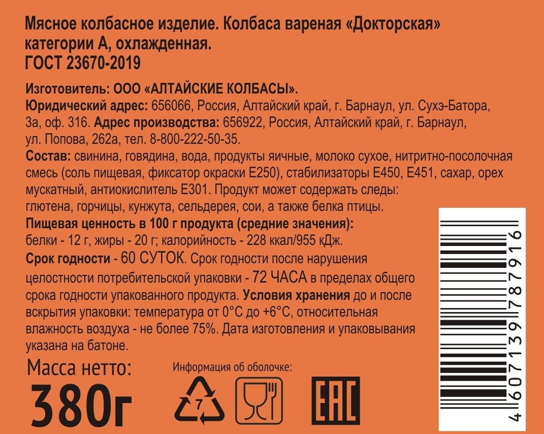 Колбаса Барнаульский пищевик Докторская вареная, 380г