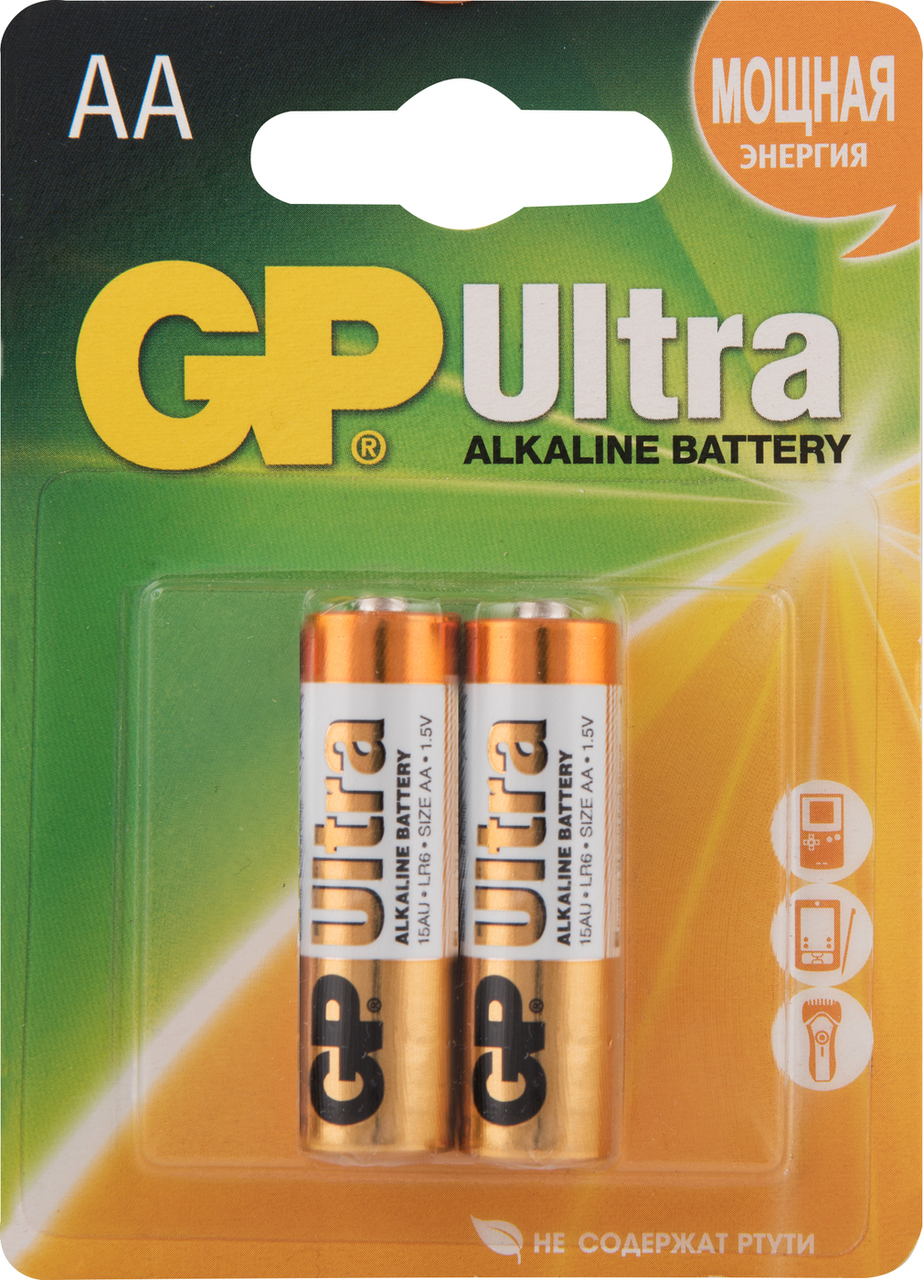 Батарейка GP Ultra Alkaline АА (LR6) 2 шт. (15АU-CR2)Батарейки Ultra Alkaline AA предназначены для устройств, нуждающихся в повышенном потреблении энергии. Это фотоаппараты, микрофоны, диктофоны, аудио устройства, фотовспышки, цифровые камеры, радиоуправляемые модели, игровые консоли и т.п. Батарейки GP хранятся в 3,5 раза дольше обычных солевых батареек. Они сохраняют рабочие свойства в течение семи лет, тогда как солевые теряют заряд всего за два года. Компактная блистерная упаковка из двух батареек – это удобный мини-запас для ваших устройств, который легко взять с собой в любую поездку.