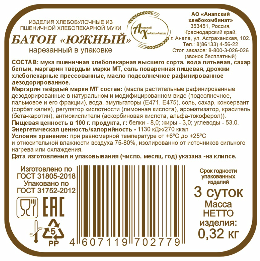 Батон Анапский ХК Южный нарезка, 320г