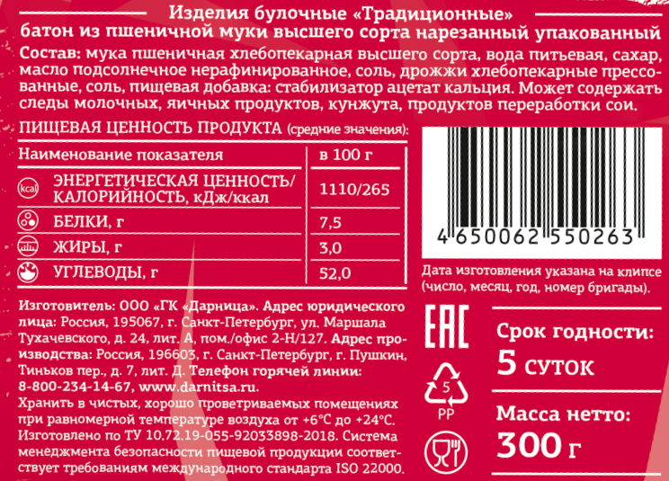 Мука пшеничная хлебопекарная высшего сорта, вода питьевая, сахар, масло подсолнечное нерафинированное, дрожжи хлебопекарные прессованные, соль, пищевая добавка: стабилизатор ацетат кальция.