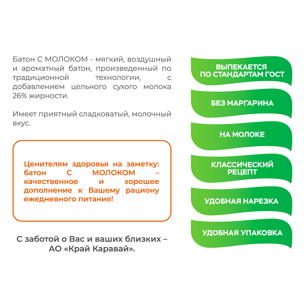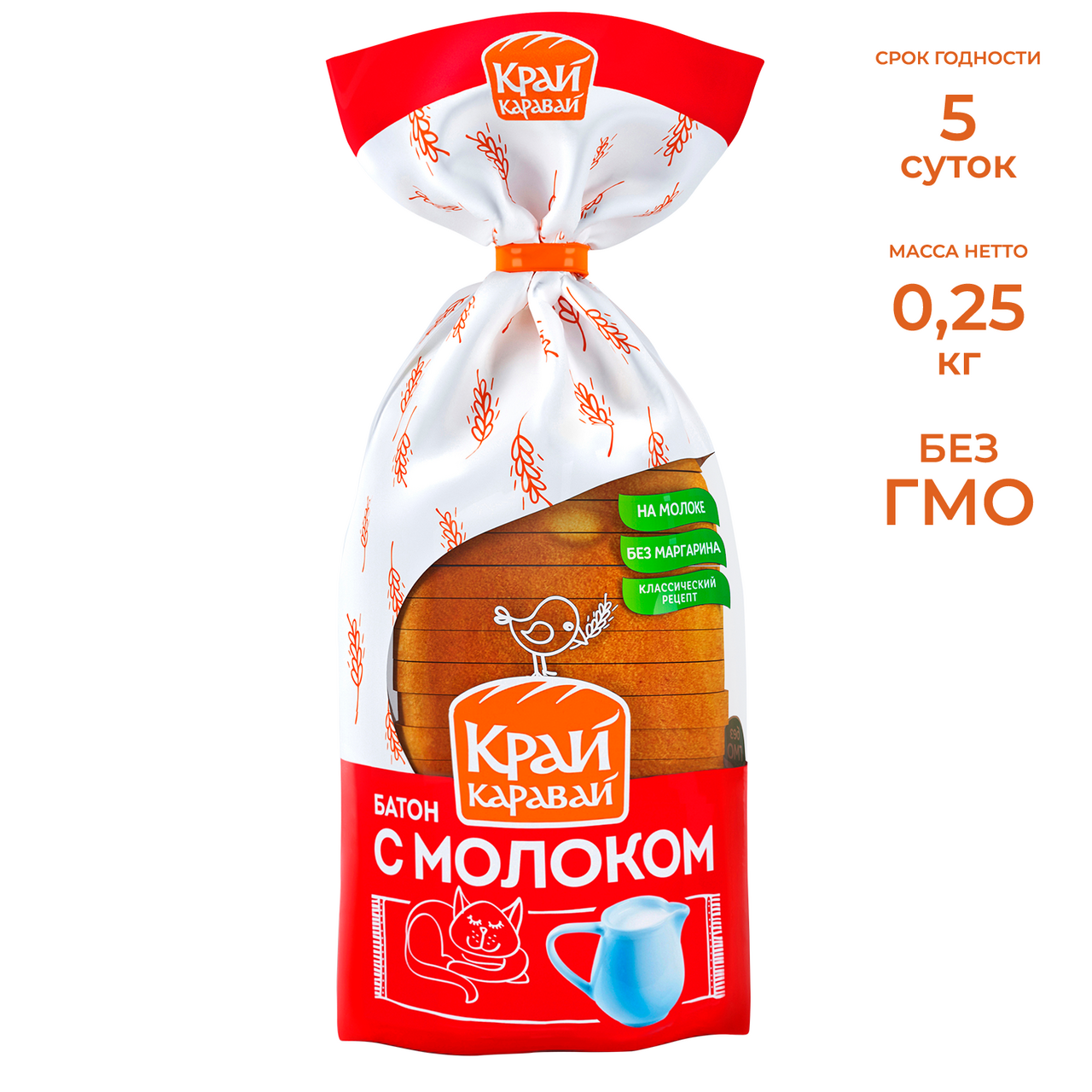 Батон Край каравай с молоком нарезанный, 250г с аппетитной золотистой корочкой и знакомым всем вкусом – идеальная основа для любимых бутербродов. Это 100% натуральный продукт – без улучшителей и консервантов. Ароматный батон подходит для приготовления бутербродов и отлично сочетается с супами, мясными и рыбными блюдами, а также сливочным маслом.