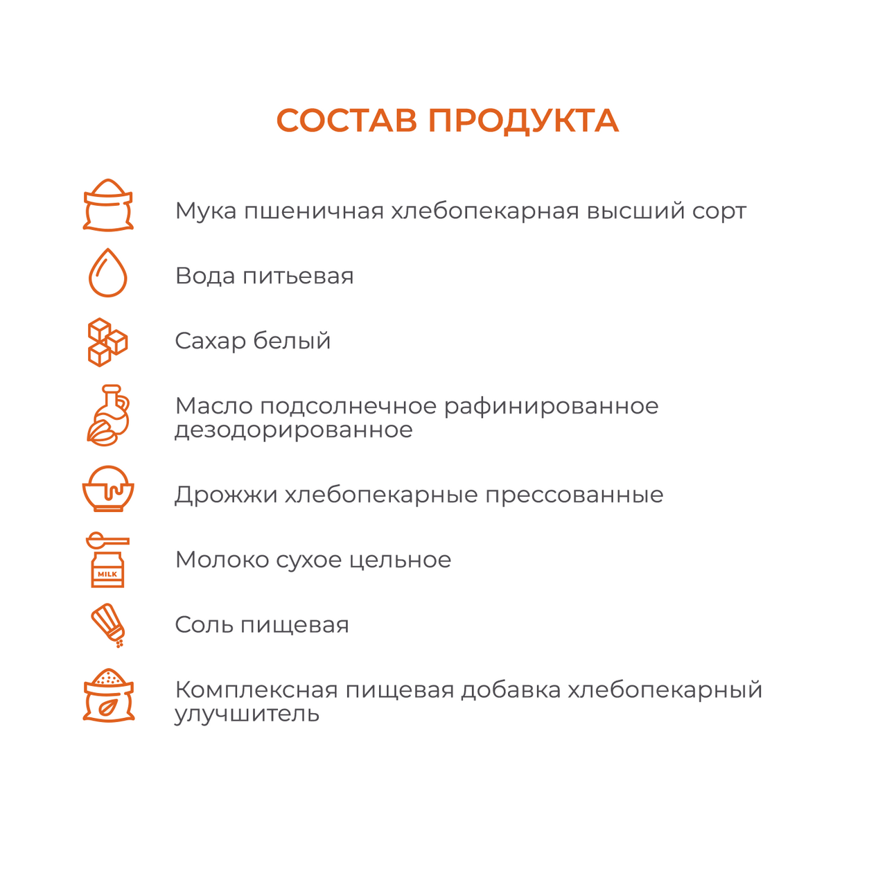 Мука пшеничная хлебопекарная высшего сорта, вода питьевая, сахар, масло подсолнечное, соль, дрожжи хлебопекарные.