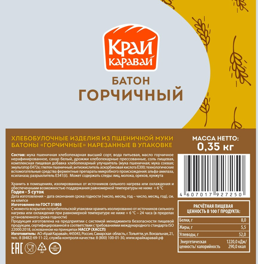 Мука пшеничная хлебопекарная высший сорт, вода питьевая, масло горчичное нерафинированное, сахар белый, дрожжи хлебопекарные прессованные, соль пищевая, комплексная пищевая добавка хлебопекарный улучшитель мука пшеничная; мука соевая; эмульгатор Е472е; глютен пшеничный; антиокислитель аскорбиновая кислота Е300; технологические вспомогательные средства ферментные препараты микробного происхождения: альфа-амилаза, ксиланаза; разрыхлитель Е341ii.