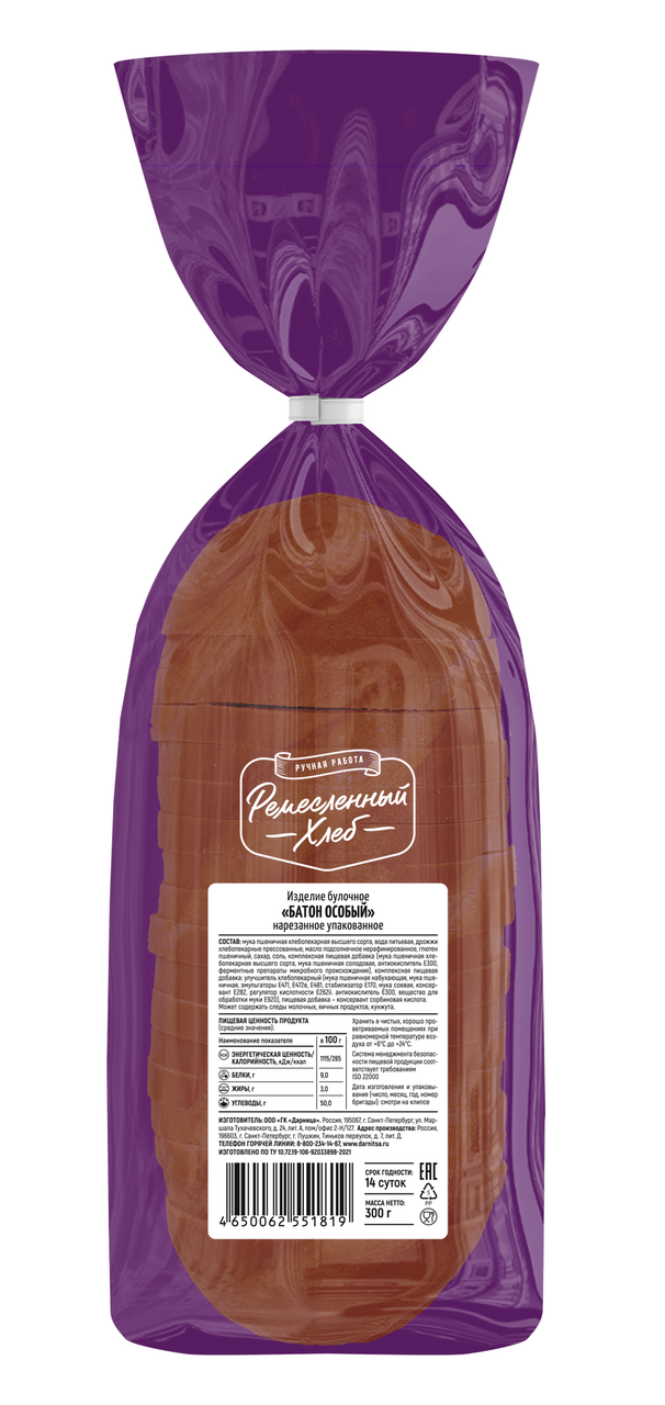 Батон особый Ремесленный хлеб на опаре нарезка, 300г