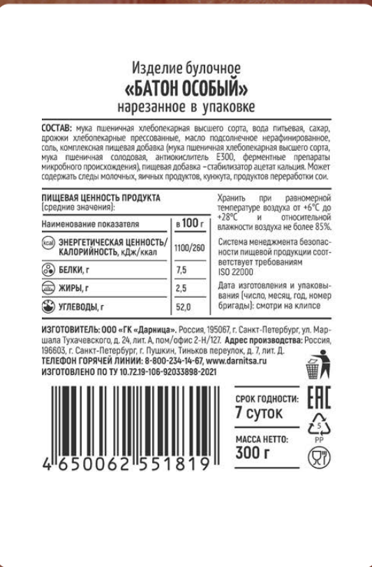 Мука пшеничная хлебопекарная высшего сорта, вода питьевая, сахар, дрожжи хлебопекарные прессованные, масло подсолнечное нерафинированное, соль, комплексная пищевая добавка, мука пшеничная солодовая, антиокислитель Е300, ферментные препараты микробного происхождения, пищевая добавка стабилизатор ацетат кальция.