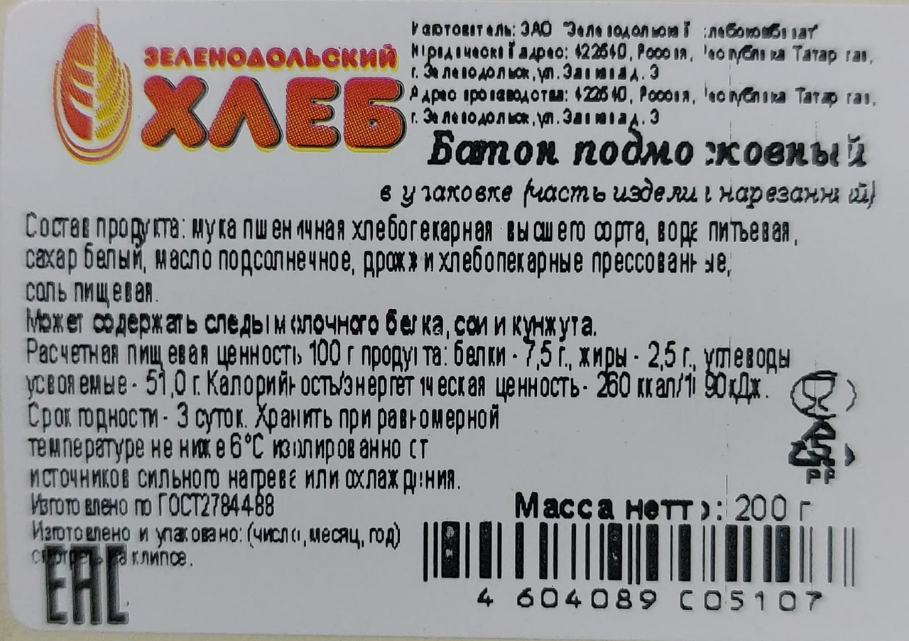 Батон Зеленодольский хлеб Подмосковный, 200г