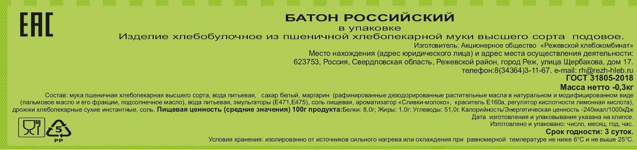Батон российский идеально подходит для приготовления бутербродов, например, с икрой, рыбой, сыром. Мякиш хорошо пропеченный, эластичный, однородный, мелкопористый. Непревзойденный вкус классического нарезного батона из муки пшеничной высшего сорта, изготовленного по опарной технологии.