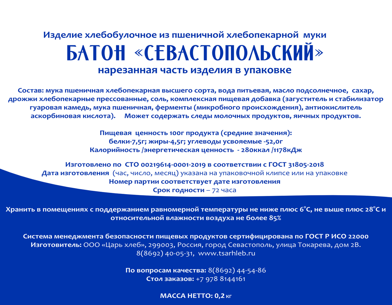 Батон Царь хлеб Севастопольский нарезной, 200г