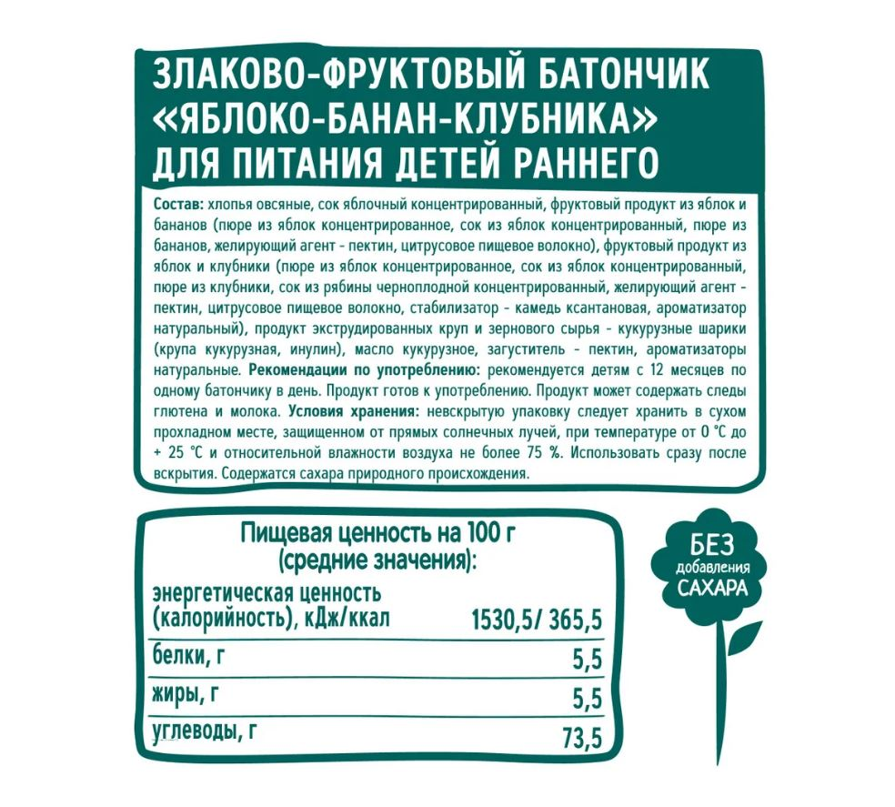 Хлопья овсяные, сок яблочный концентрированный, фруктовый продукт из яблок и бананов (пюре из яблок концентрированное, сок из яблок концентрированный, пюре из бананов, желирующий агент - пектин, цитрусовое пищевое волокно), фруктовый продукт из яблок и клубники (пюре из яблок концентрированное, сок из яблок концентрированный, пюре из клубники, сок из рябины черноплодной концентрированный, желирующий агент - пектин, цитрусовое пищевое волокно, стабилизатор - камедь ксантановая, ароматизатор натуральный), продукт экструдированных круп и зернового сырья - кукурузные шарики (крупа кукурузная, инулин), масло кукурузное, загуститель- пектин, ароматизаторы натуральные.