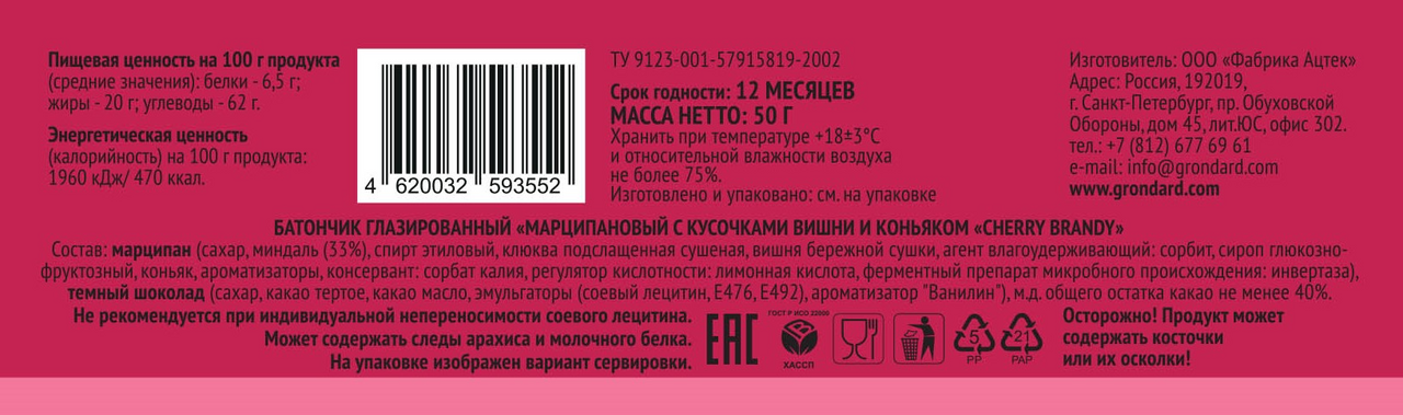 Батончик марципановый Grondard Cherry Brandy, 50г