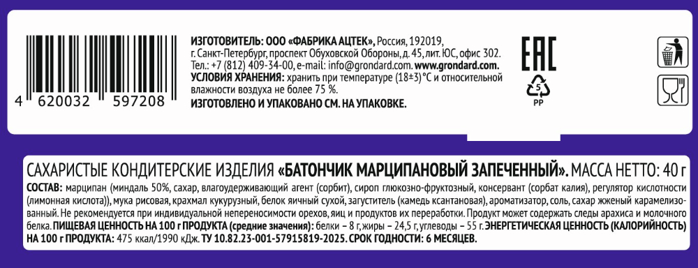 Классический запеченный марципановый батончик. Представляем вашему вниманию изысканное лакомство, которое покорит вас с первого кусочка. В запеченном марципане раскрывается вся полнота классического вкуса марципана, имеет ярко выраженный вкус миндаля и домашней выпечки. Это уникальный продукт в сегменте премиальных снеков, сочетающий в себе традиции европейского кондитерского искусства и современные технологии производства. Откройте для себя новый уровень наслаждения - запечённый марципан премиального качества.