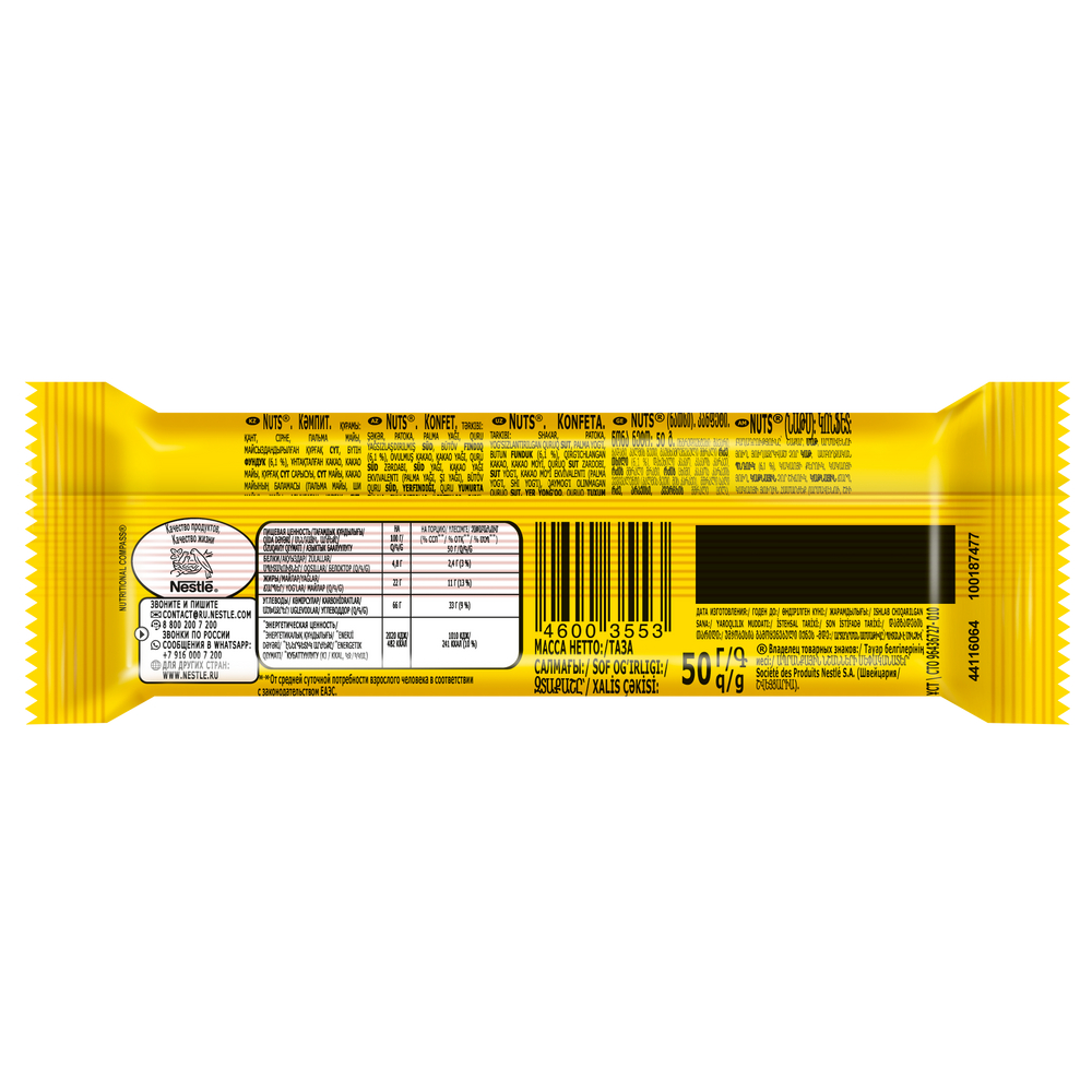 Батончик Nestle Nuts шоколадный, 50г – единственный батончик с цельными лесными орехами на российском рынке. Изумительное сочетание отборного фундука, тягучей карамели, нежной нуги и высококачественного молочного шоколада никого не оставит равнодушным. Конфета отлично подходит для сытного перекуса или чаепития, а благодаря орехам еще и стимулирует мозговую активность. Компактный размер, удобный формат и индивидуальная упаковка позволяют взять ее с собой куда угодно: на работу, на учебу, на прогулку, в дорогу.