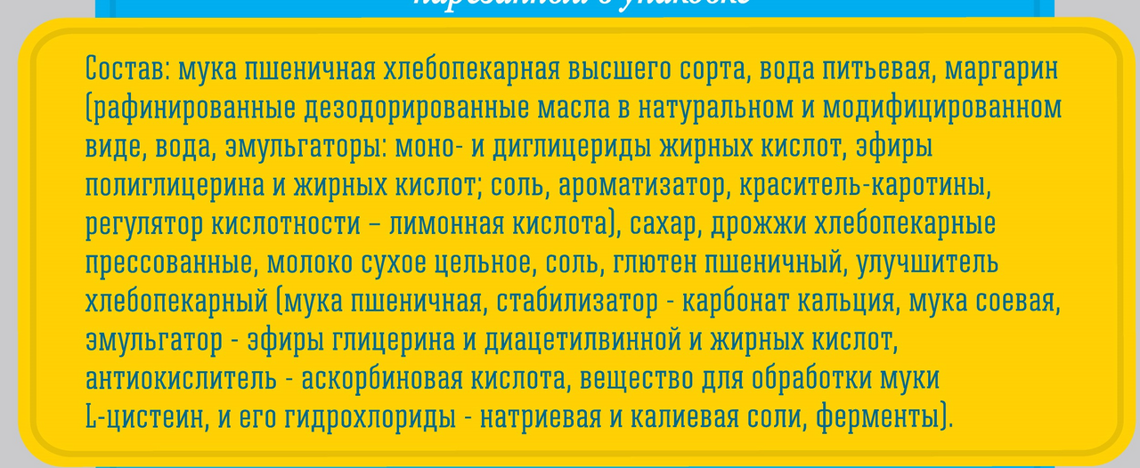 Мука пшеничная хлебопекарная высшего сорта, вода питьевая, маргарин (рафинированные дезодорированные масла в натуральном и модифицированном виде, вода, эмульгаторы: моно- и диглицериды жирных кислот, эфиры полиглицерина и жирных кислот; соль, ароматизатор, краситель-каротины, регулятор кислотности – лимонная кислота), сахар, дрожжи хлебопекарные прессованные, молоко сухое цельное, соль, глютен пшеничный, улучшитель хлебопекарный (мука пшеничная, стабилизатор- карбонат кальция, мука соевая, эмульгатор - эфиры глицерина и диацетилвинной и жирных кислот, антиокислитель-аскорбиновая кислота, вещество для обработки муки L-цистеин, и его гидрохлориды-натриевая и калиевая соли, ферменты).