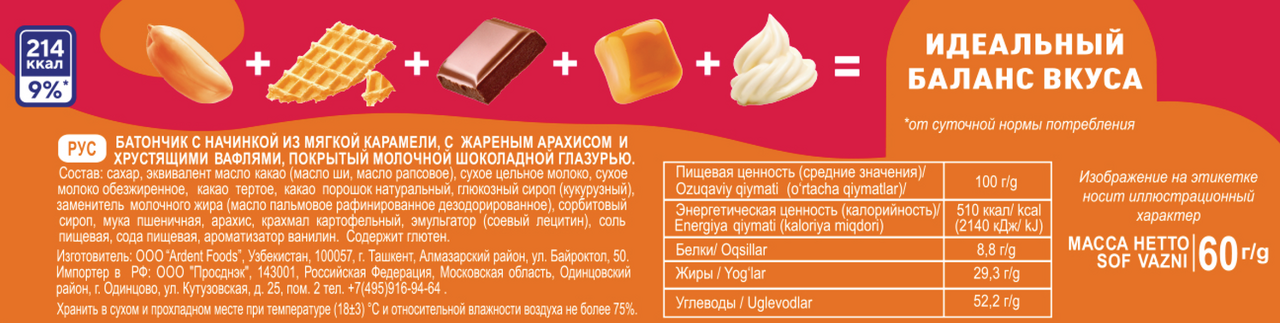 Сахар, эквивалент масло какао (масло ши, масло рапсовое), сухое цельное молоко, сухое молоко обезжиренное, какао тертое, какао порошок натуральный, глюкозный сироп (кукурузный), заменитель молочного жира (масло пальмовое рафинированное дезодорированное), сорбитовый сироп, мука пшеничная, арахис, крахмал картофельный, эмульгатор (соевый лецитин), соль пищевая, сода пищевая, ароматизатор ванилин.