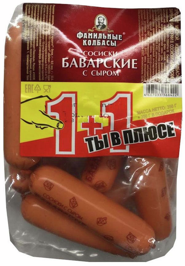 Сосиски Фамильные колбасы Баварские с сыром 1+1, 350г