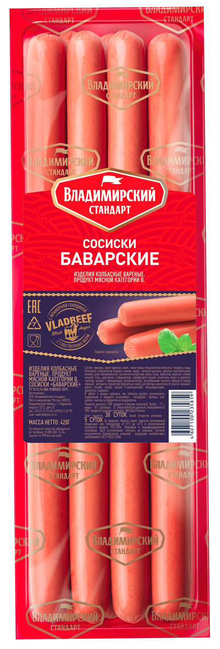 Сосиски Владимирский стандарт Баварские, 420г – отличный выбор в качестве плотного и сытного завтрака и перекуса в течение дня. Обладают мягкой консистенцией, однородной структурой и насыщенным вкусом. За счет высокой калорийности помогают быстро восстановить энергозатраты организма, например, во время обеденного перерыва на работе. В процессе производства используется несколько видов мяса: свинина, ��овядина и курица (кусковая и механической обвалки. Также в составе присутствует шпик. Экстракты пряностей придают продукт яркие пикантные оттенки. Продукт обладает богатым химическим составом, в котором присутствуют полезные для организма витамины и минеральные вещества. Баварские сосиски хорошо сочетаются с хлебом и различными гарнирами, например, отваренными овощами, макаронами и крупами. Также их можно использовать в качестве начинки для приготовления пиццы и выпечки. Для фасовки используется плотная упаковка. Хранить, соблюдая температурный режим от 0 до +6 градусов. Приобрести сосиски Владимирский стандарт Баварские, 420г можно в торговом центре METRO.МПК Владимирский стандарт начинал свою деятельность в 2000 году с производства небольших объемов колбасных изделий и замороженных полуфабрикатов. На сегодняшний день это динамично развивающееся предприятие в городе Радужный (Владимирская область), на котором ежемесячно производится более 5 тыс. т. продукции. Компания сертифицирована в соответствии с ГОСТ Р ИСО 22000, который основан на принципах ХАССП. Благодаря строгому соблюдению технологического процесса и многоступенчатому контролю, осуществляемому на каждом этапе, обеспечивается выпуск продукции высокого качества. Ассортиментный ряд насчитывает более 100 наименований. В компании используется система управления CSB-system, обеспечивающая учет и контроль на всех этапах производственного цикла. Продукция под этой торговой маркой поставляется не только в регионы РФ, но и некоторые страны ближнего зарубежья.