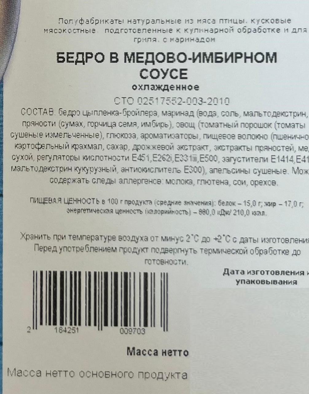 Бедро цыпленка-бройлера, маринад вода, соль, мальтодекстрин, пряности сумах, горчица семя, имбирь, овощ томатный порошок томаты сушеные измельченные, глюкоза, ароматизаторы, пищевое волокно пшеничное, картофельный крахмал, сахар, дрожжевой экстракт, экстракты пряностей, мед сухой, регуляторы кислотности Е262i, Е331iii, Е451, Е500, загустители Е415, Е1414, мальтодекстрин кукурузный, антиокислитель Е300, апельсины сушеные.