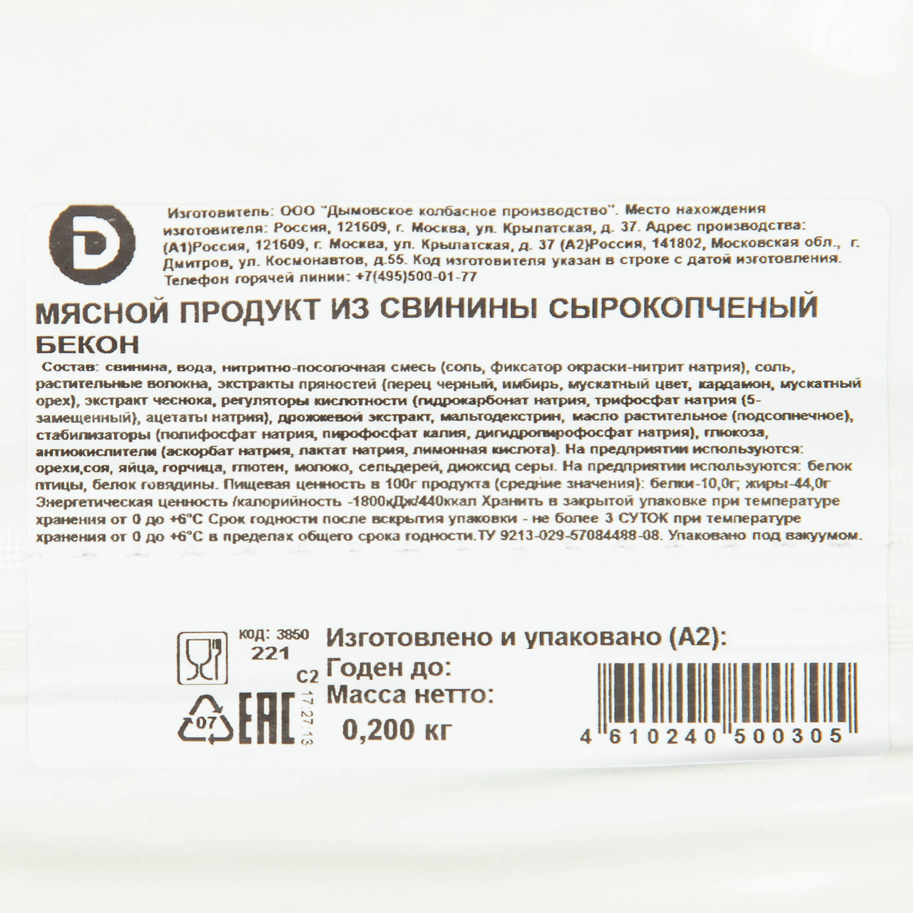 Бекон Дымов сырокопченый, 200г
