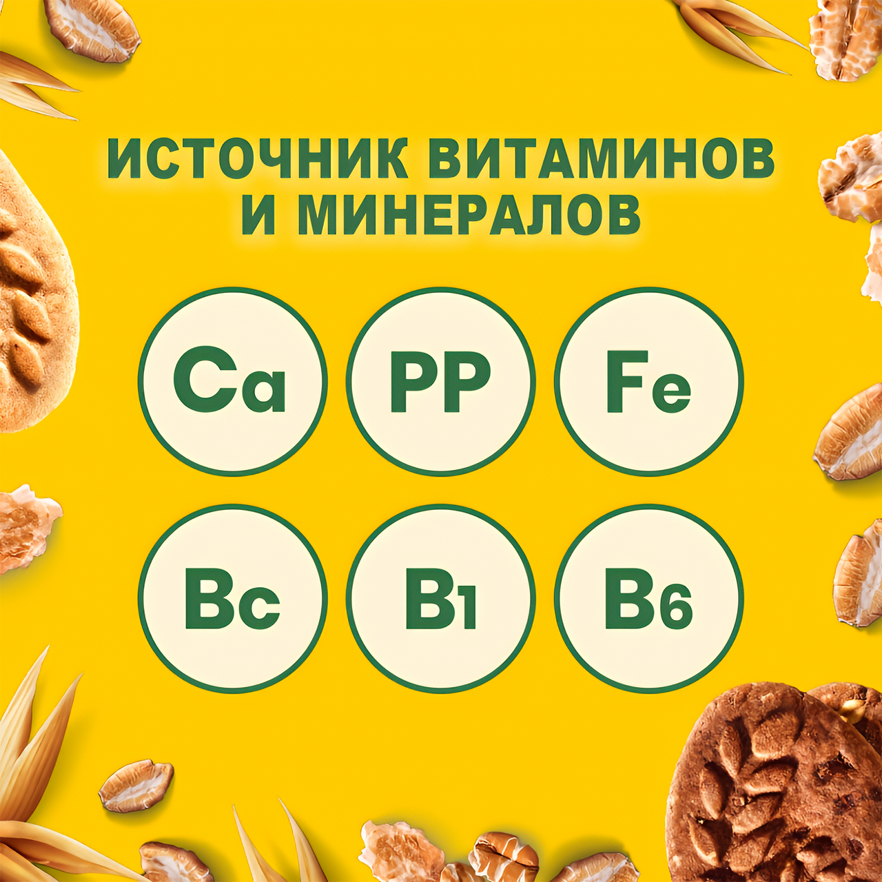 Мука 57,2% (пшеничная, ячменная цельнозерновая), сахар, масла растительные (рапсовое, пальмовое), хлопья овсяные 6,52%, вода, мёд 2,1%, отруби пшеничные 1,87%. разрыхлитель (гидрокарбонат натрия), фундук обжаренный дробленный 0,6%, соль, эмульгатор (лецитин соевый), регулятор кислотности (кислота лимонная), ароматизаторы, витаминно-минеральный комплекс (витамин В1; витамин В2; витамин В6; витамин РР; витамин Вс; железо).