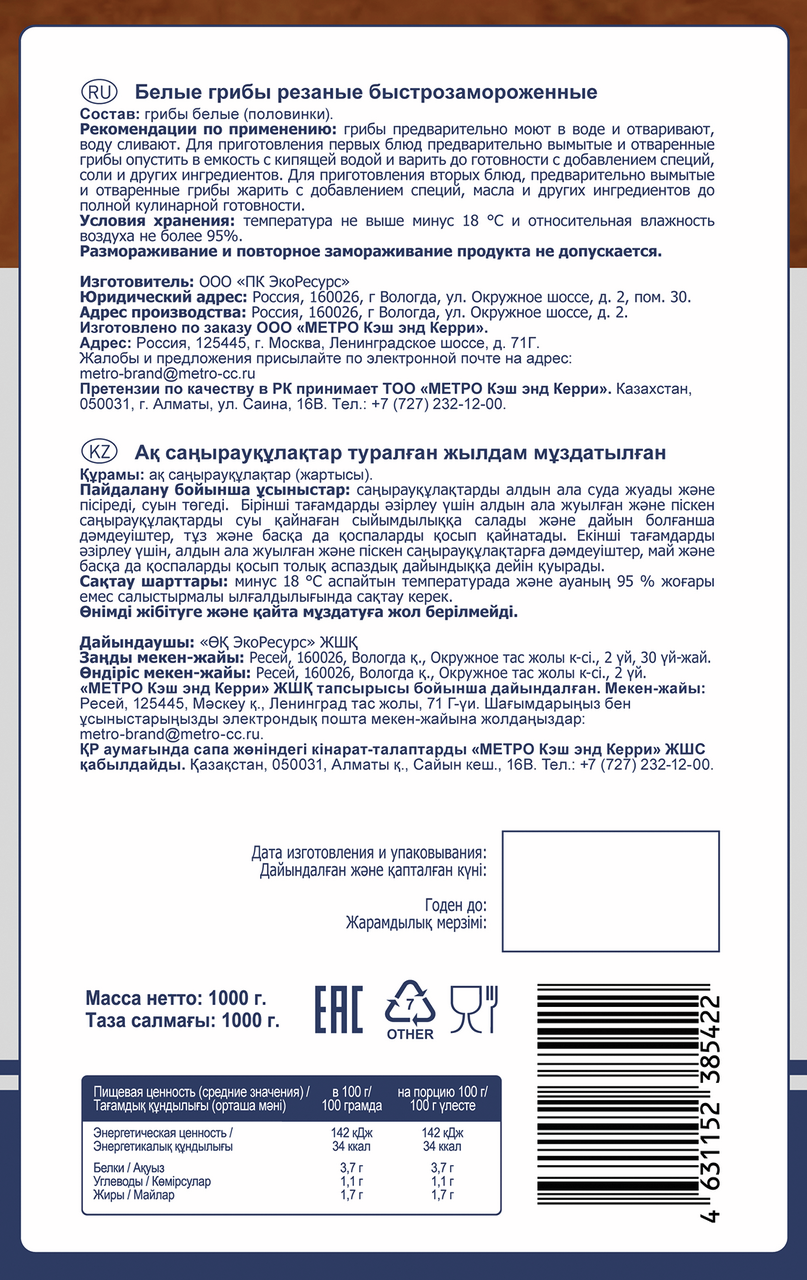 Грибы белые половинки METRO Chef замороженные, 1 кг подходят для приготовления различных кулинарных блюд. Продукт помогает избавиться от лишнего веса благодаря своей низкокалорийности (17-25 ккал на 100 г). Его богатый состав положительно влияет на работу нервной, кровеносной систем: селен, аскорбиновая кислота, кальций, железо, рибофлавин и фитогормон, а также марганец, лецитин, цинк и магний. Продукт популярен в русской, итальянской и французской кухнях. Он подвергается термической обработке: варке, тушению, маринованию, солению, заморозке и сушке. Во время приготовления белые грибы не теряют свойств, идеально сочетаются с пастой, плавлеными сырами, мясными деликатесами. Они заправляются сметаной, растительным маслом или лимонным соком, дегустируются с пармезаном. Грибы также подойдут в качестве начинки для пирогов, вареников, запеканок, а в сушеном растертом виде усилят вкус соусов и бульонов.