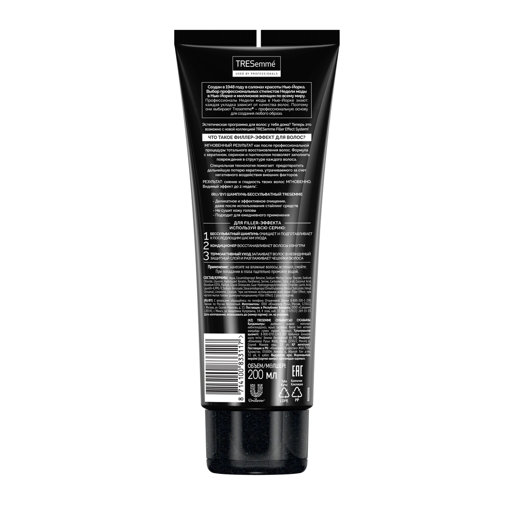 Эстетическая программа для волос у тебя дома? Теперь это возможно с новой коллекцией Тресемме FILLER Effect!ЧТО ТАКОЕ ФИЛЛЕР - ЭФФЕКТ ДЛЯ ВОЛОС?Мгновенный результат как после профессиональной процедуры тотального восстановления волос. Формула с кератином, серином и пантенолом позволяет заполнить повреждения в структуре каждого волоса. Специальная технология помогает предотвратить дальнейшу�� потерю кератина, утрачиваемого за счет негативного воздействия внешних факторов.Результат: сияние и гладкость твоих волос МГНОВЕННО. Видимый FILLER-эффект до 2 недель.Для Filler-эффекта используй всю серию 2 раза в неделю:шаг 1. Бессульфатный шампунь эффективно, но деликатно очищает волосы, даже после использования стайлинг средств. Благодаря отсутствию в составе сульфатов, он не сушит кожу головы и подходит для ежедневного использования. А также подготавливает волосы к последующим шагам ухода.шаг 2. Кондиционер восстанавливает волосы изнутри. Насыщенная формула доставляет питательные компоненты в структуру волоса,способствует укреплению и облегчает расчесывание. Кондиционерподготавливает волосы к нанесению термоактивного завершающего ухода и подходит для регулярного использования в качестве обычного кондиционера.шаг 3. Термоактивный уход запаивает волос в невидимый защитный слой и разглаживает чешуйки волоса.Тресемме – выбор профессиональных стилистов недели моды в Нью-Йорке и миллионов женщин по всему миру. Профессионалы Недели моды в Нью-Йорке знают: каждая укладка зависит от качества волос. Поэтому они выбирают Тресемме – профессиональную основу для создания любого образа. За брендом Тресемме, который появился в салоне красоты, стоит простая истина: каждая женщина должна выглядеть и чувствовать себя великолепно, и все благодаря прическе. Тресемме создает средства для ухода за волосами и стайлинг, которые соответствуют профессиональным стандартам и позволяют создавать образы своими руками.Тресемме. Профессиональная основа для роскошных волос!