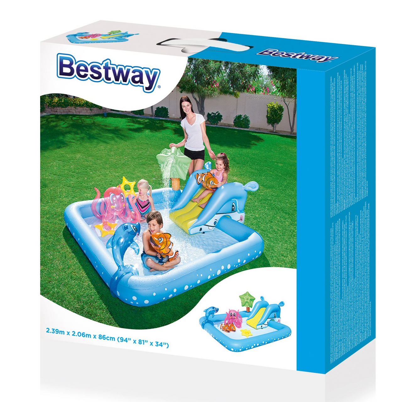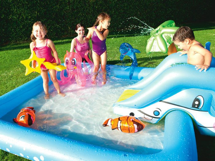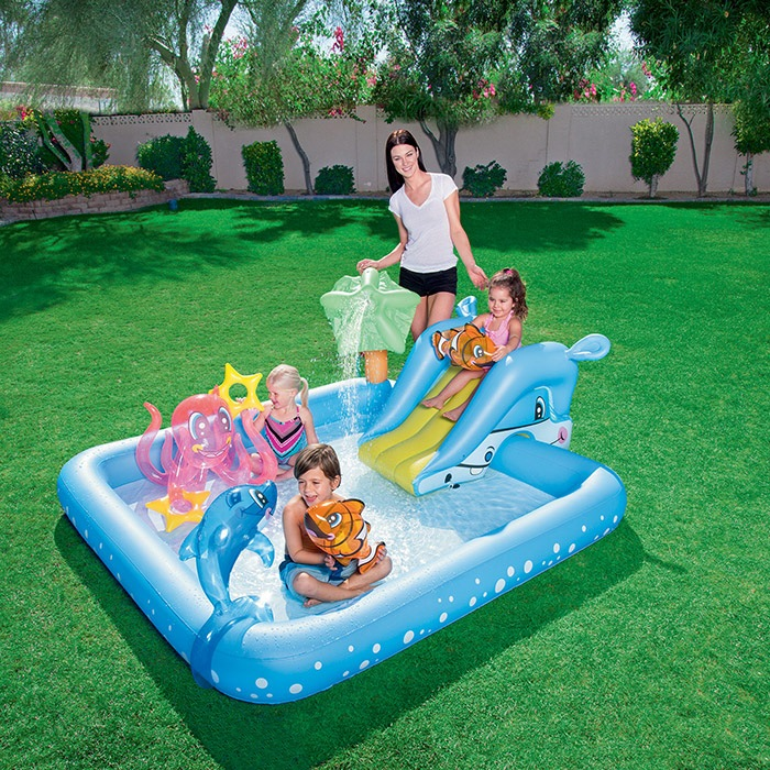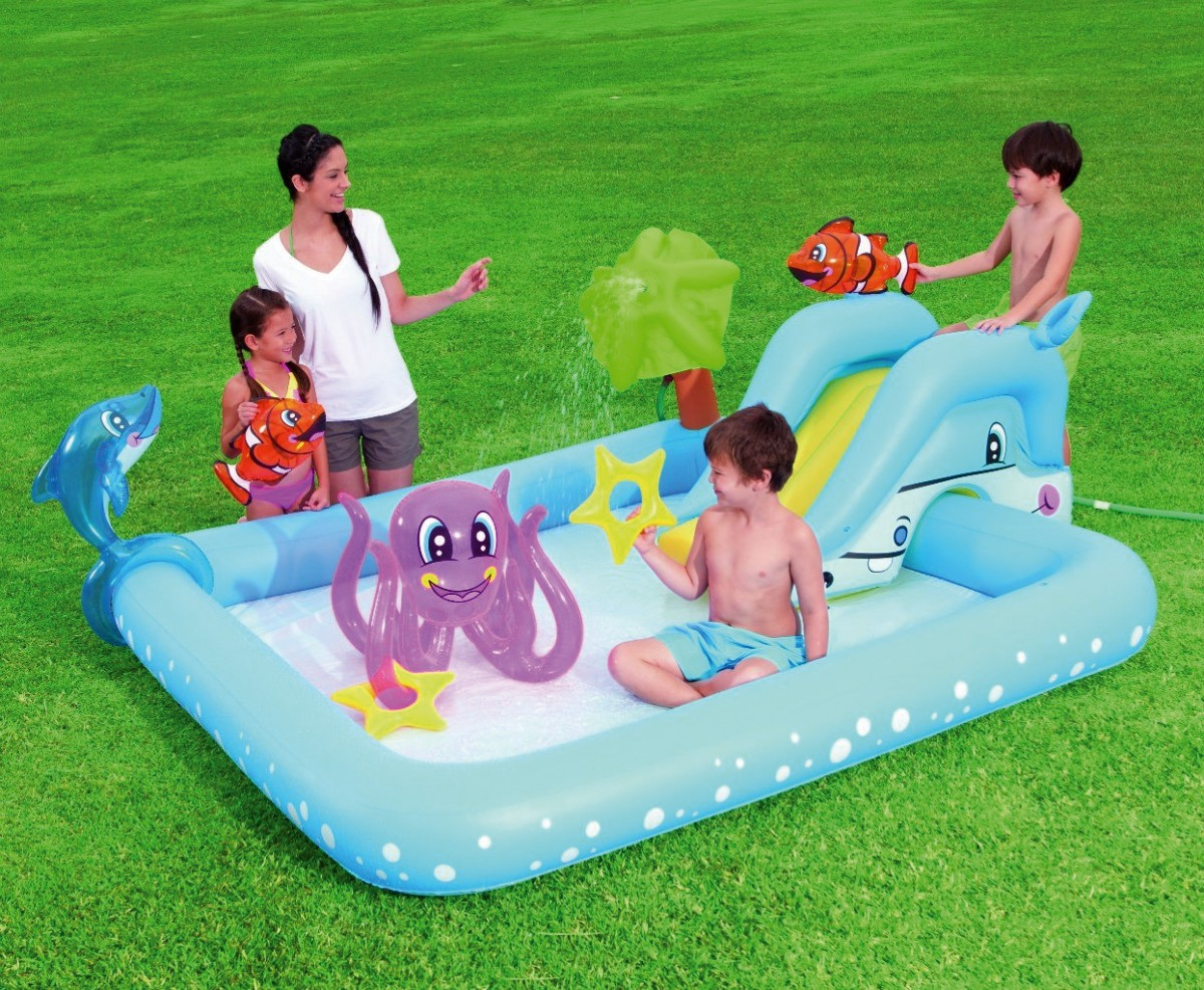 Бассейн надувной игровой Bestway Аквариум, 308 л подходит для самых маленьких. Любому малышу и родителям понравятся красочный цвет изделия и его привлекательный внешний вид. Он сделан в виде аквариума с морскими обитателями. В комплект входят надувные игрушки, в числе которых рыбки, осьминог и морская звезда. Малыш сможет длительное время наслаждаться купанием в комфортных условиях, ведь у этого бассейна есть широкие бортики и мягкое дно. Бассейн надолго увлечет ребенка. Он сможет не только купаться в воде, играть с надувными рыбками, но и прокатиться с горки. В комплект также входит разбрызгиватель, который присоединяется к садовому шлангу. Небольшие размеры упаковки позволяют брать бассейн с собой в любую поездку или путешествие. Изделие легко надувать, сдувать, хранить и транспортировать. Кроме того, присутствует специальный сливной клапан, благодаря чему можно производить слив воды максимально быстро. Если на бассейне появятся повреждения, то это не станет сильной головной болью, ведь в набор входит комплект для ремонта.